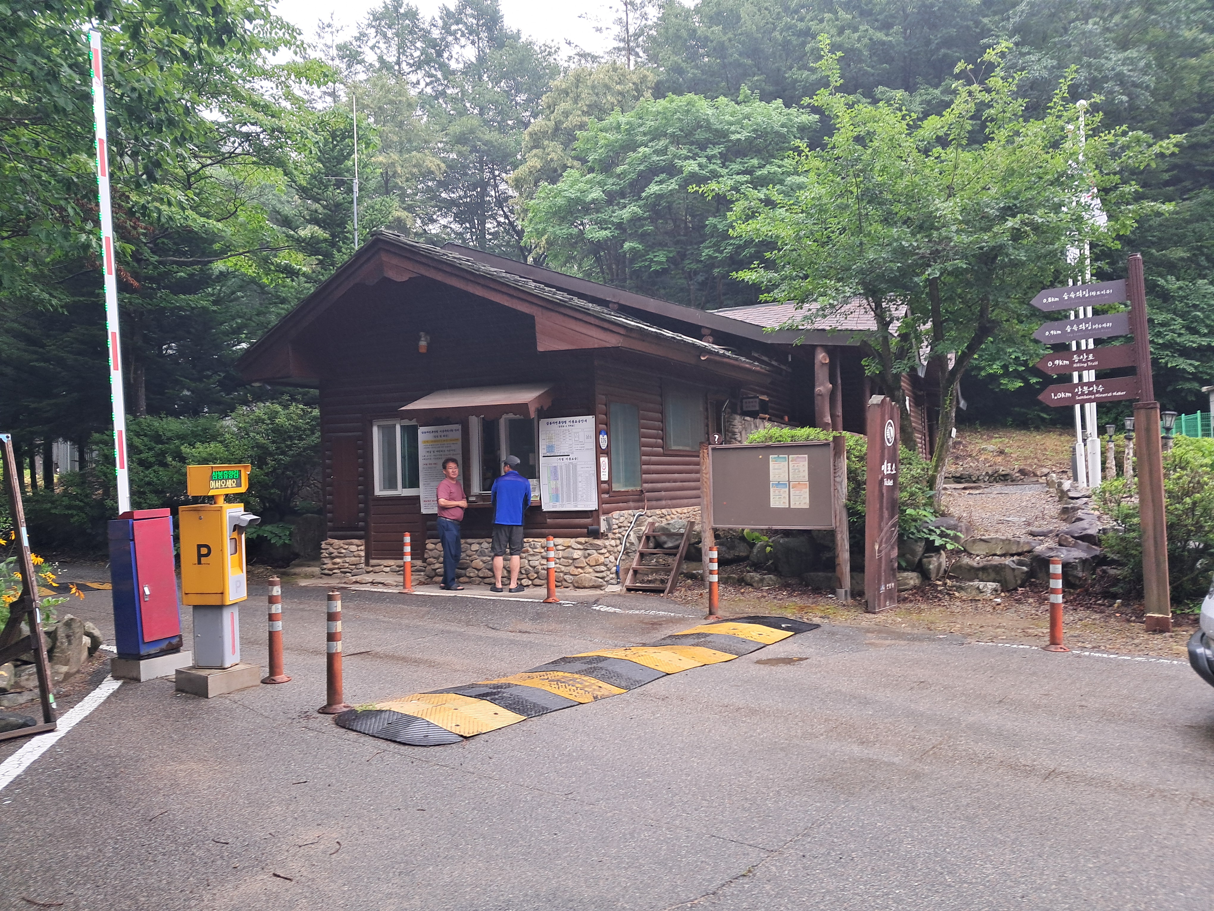휴양림 매표소 우리 일행이 예약 확인을 하고 있다