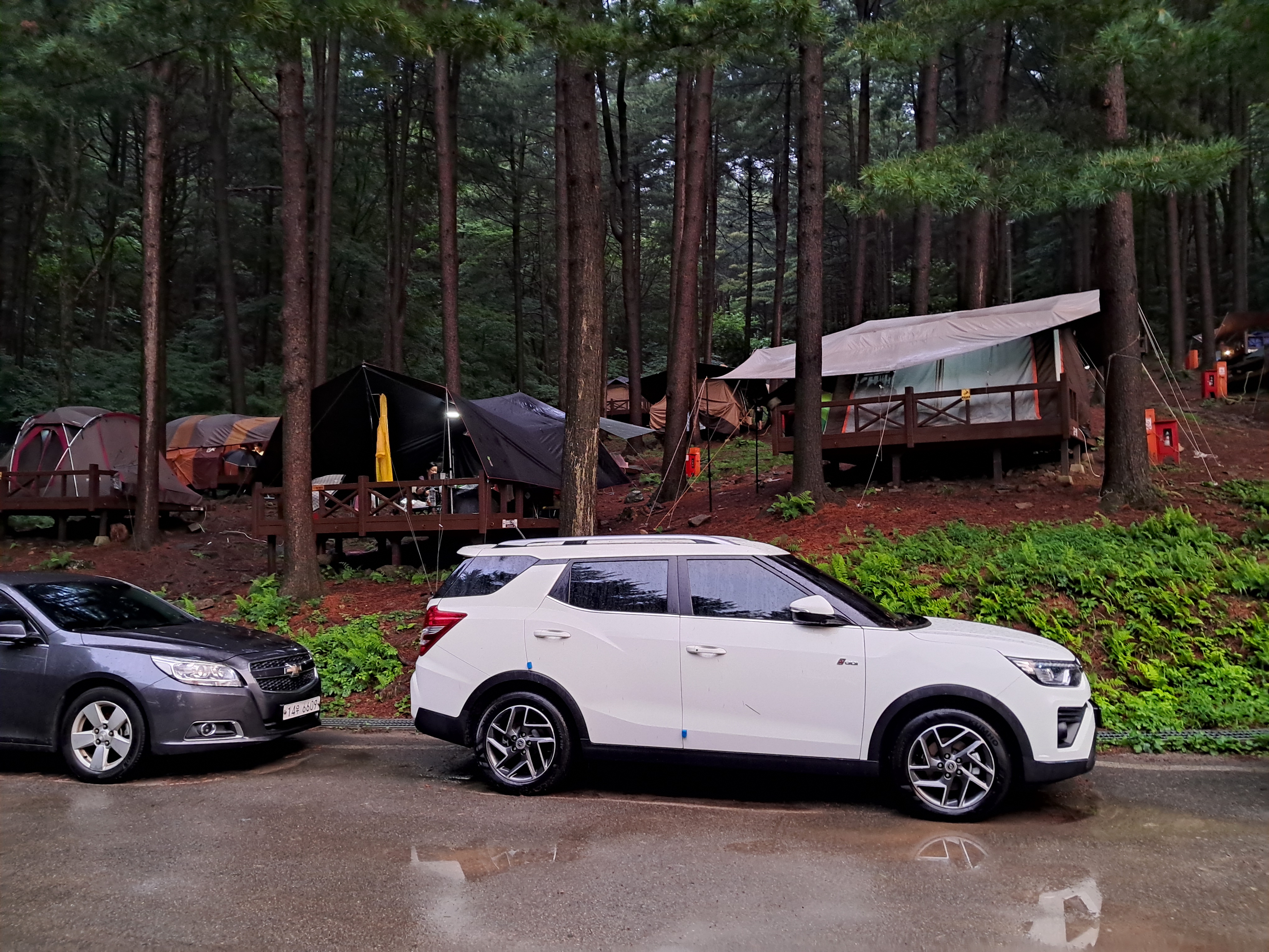 비가 내리고 있지만 휴가 기간이라서인지 비어 있는 데크가 없을 정도로 다 차있고 주차장도 만차에 가깝다