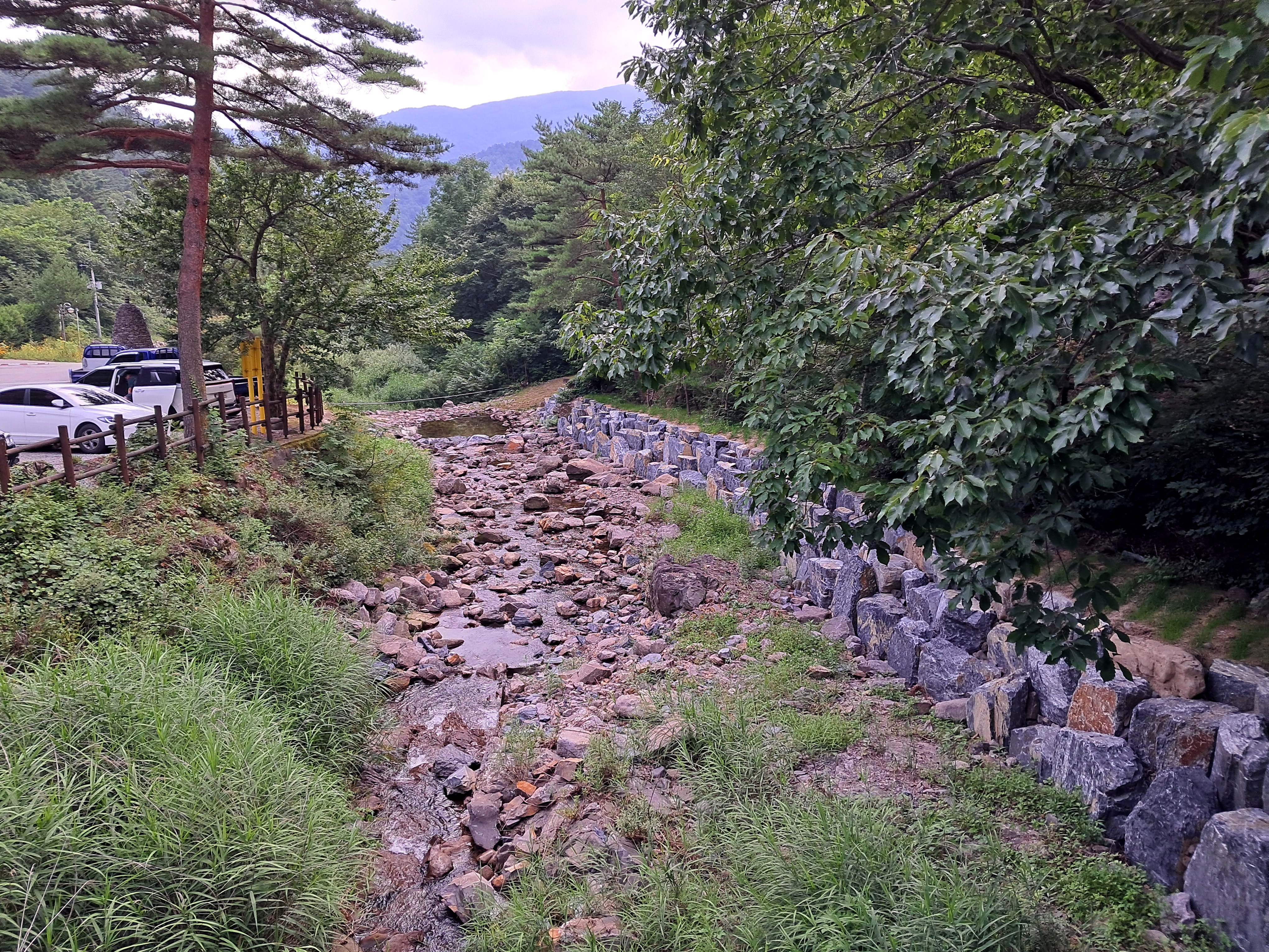 아래와 같은 계곡물이 흐르고 있어 물고기도 잡았는데 아침에 잡은 것은 불법어로라고