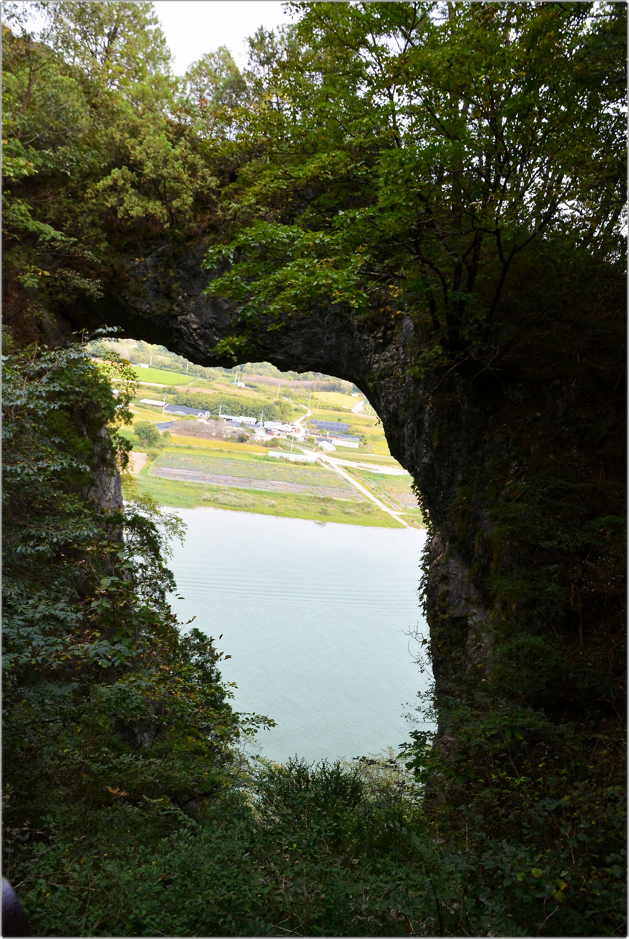 둥그렇게 열린 석문 안에 남한강의 시원한 풍경이 가득 차 있다.