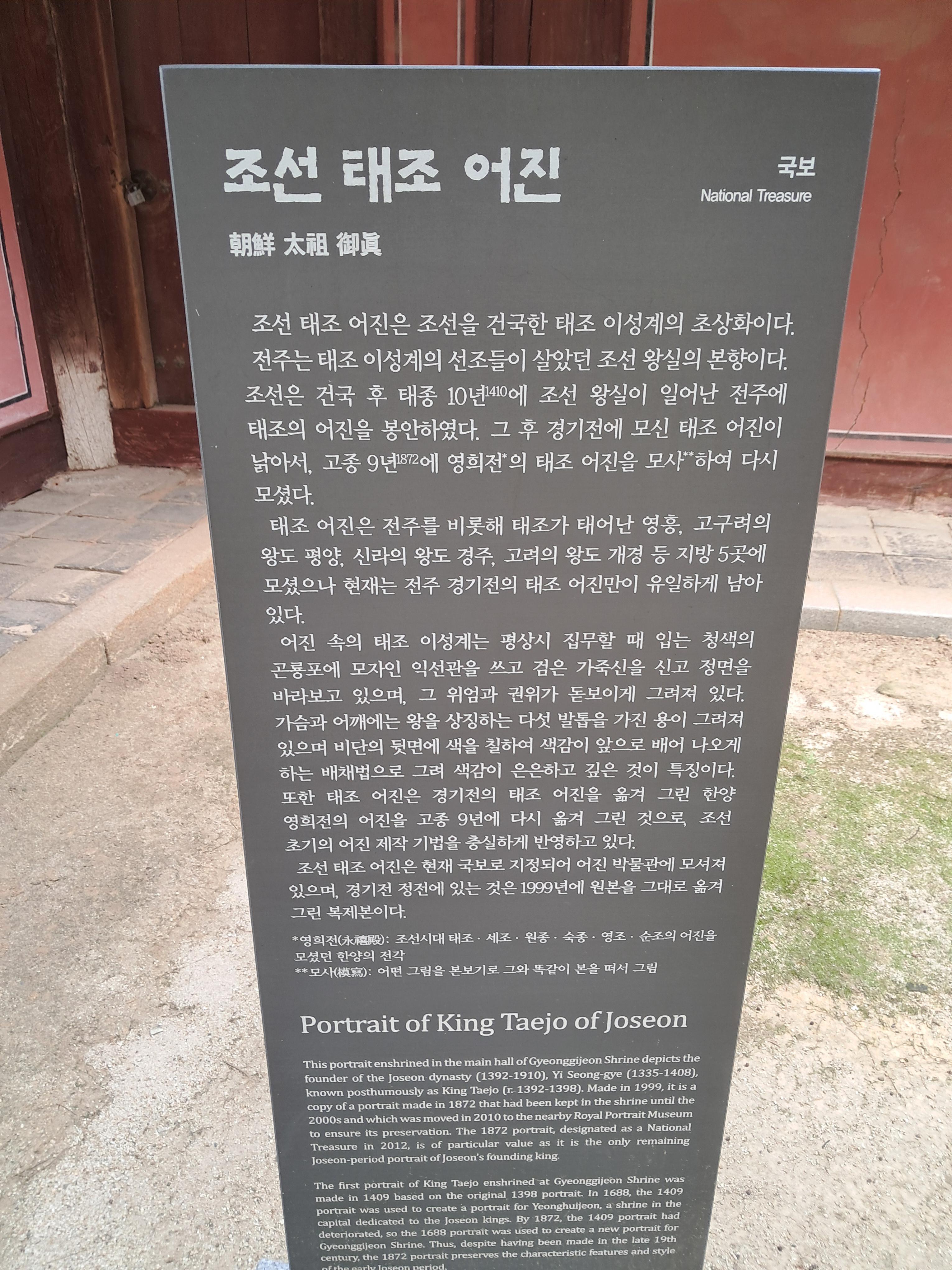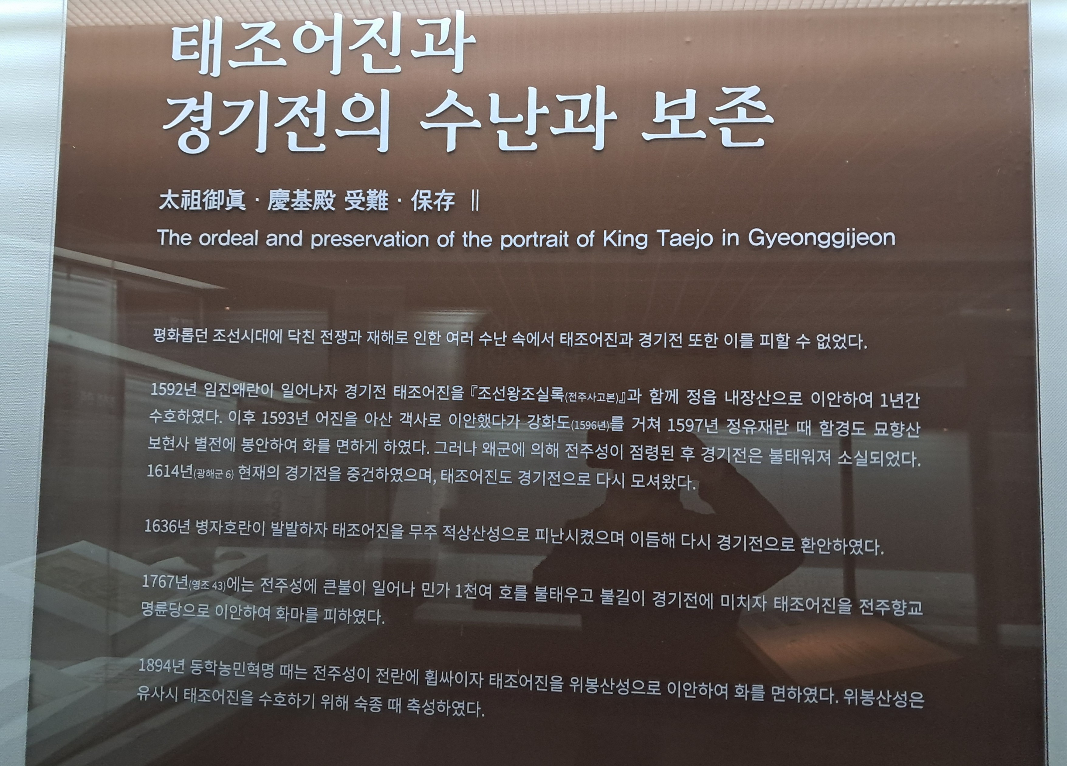 1410년에 경기 전에 봉안되었던 것이다. 임진왜란 당시 모든 이성계의 어진들이 왜군의 손에 불타 사라질 때 전주