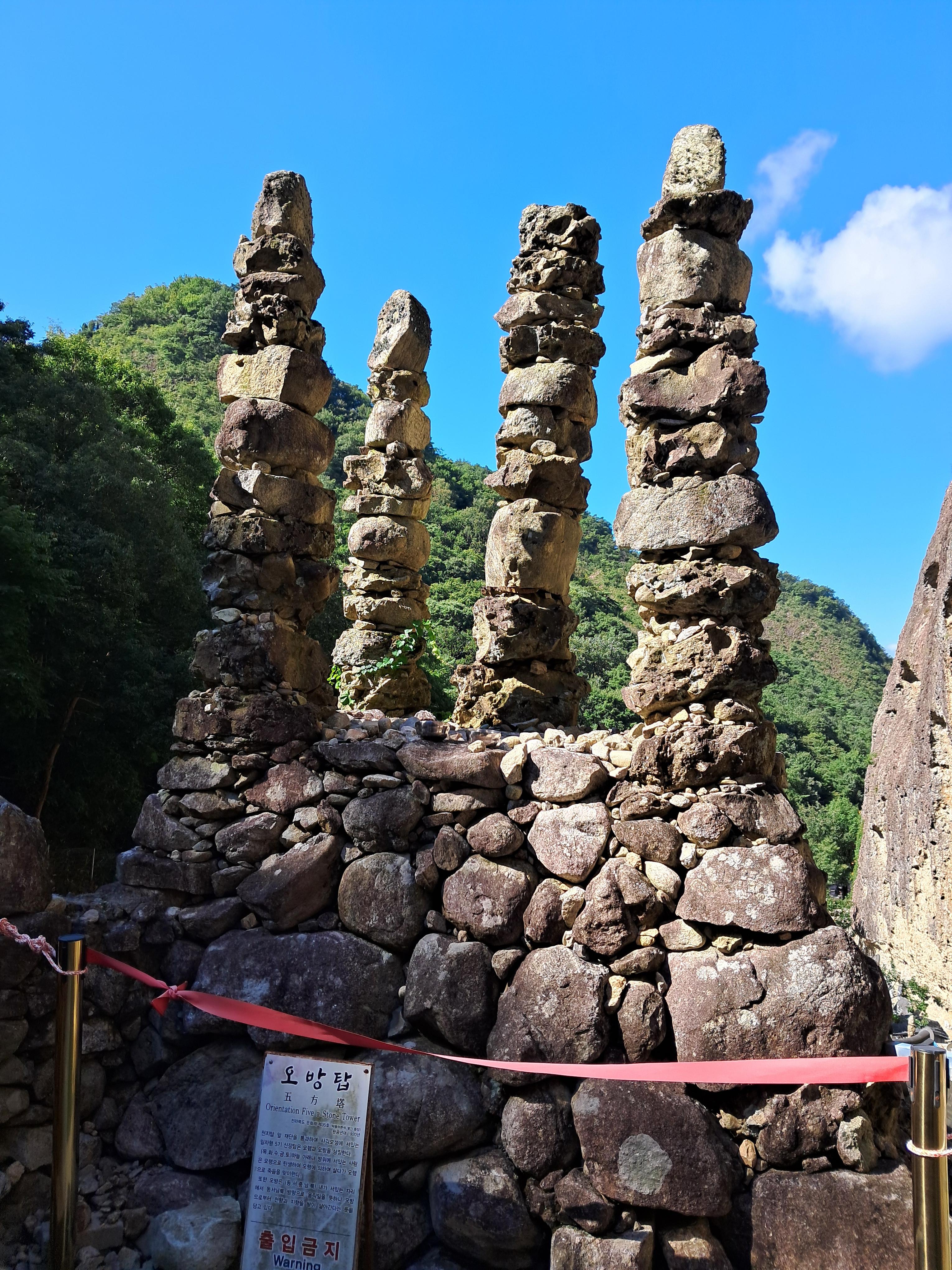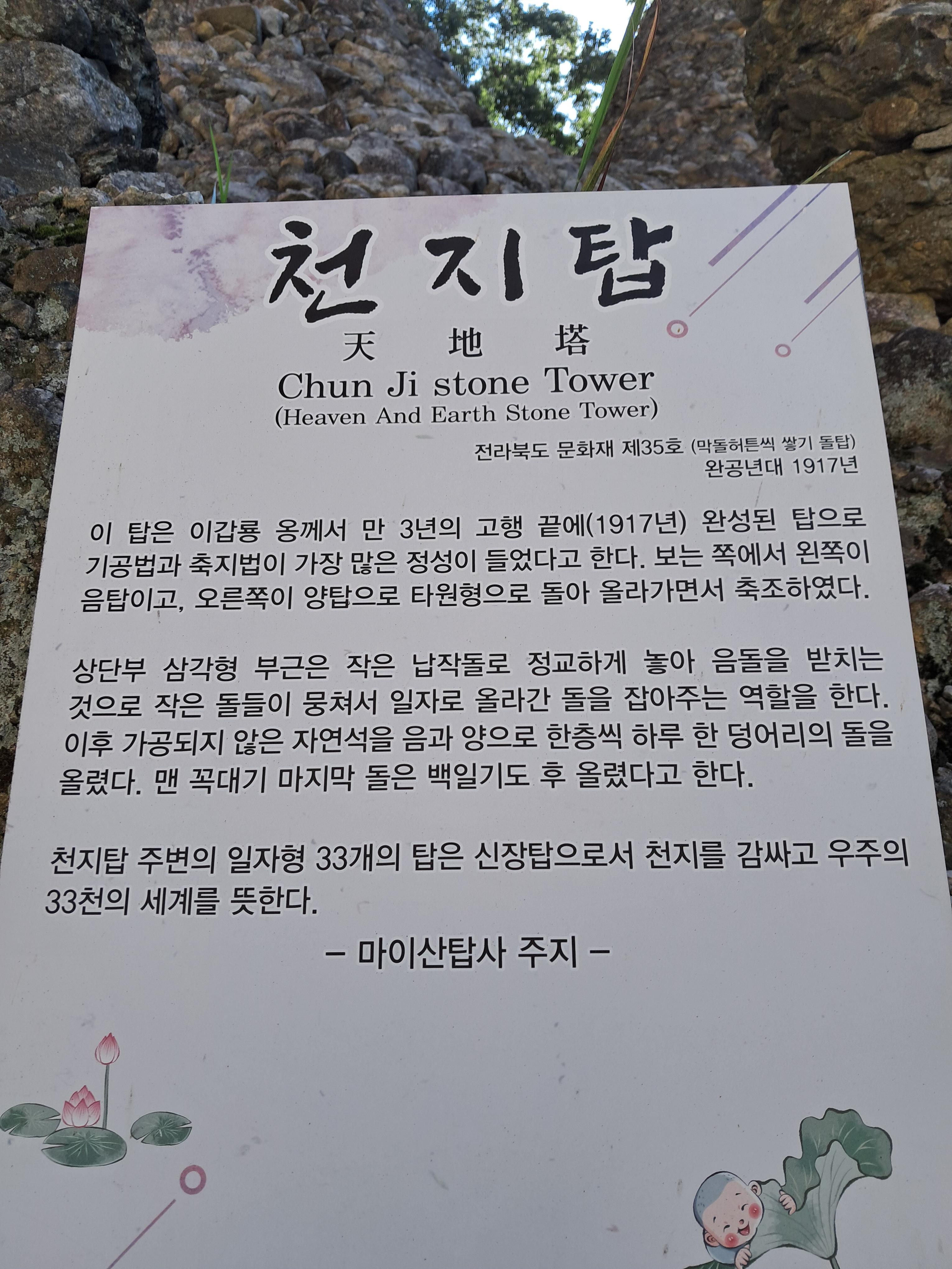 천지일월과 오행 이치를 담은 천지탑, 오방탑, 일광탑, 월광탑을 비롯하여 80여 개가 있는데, 태풍이 불어