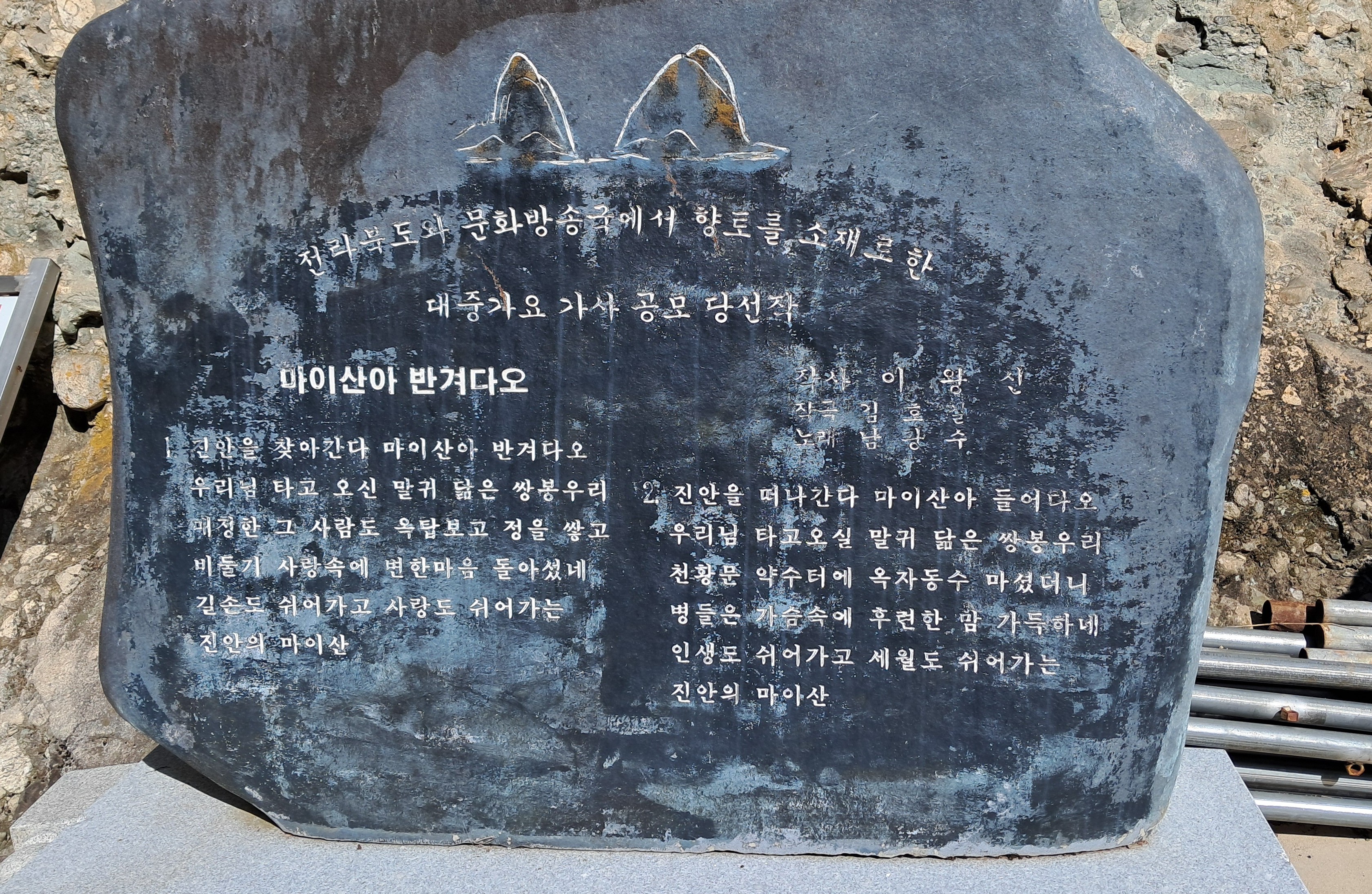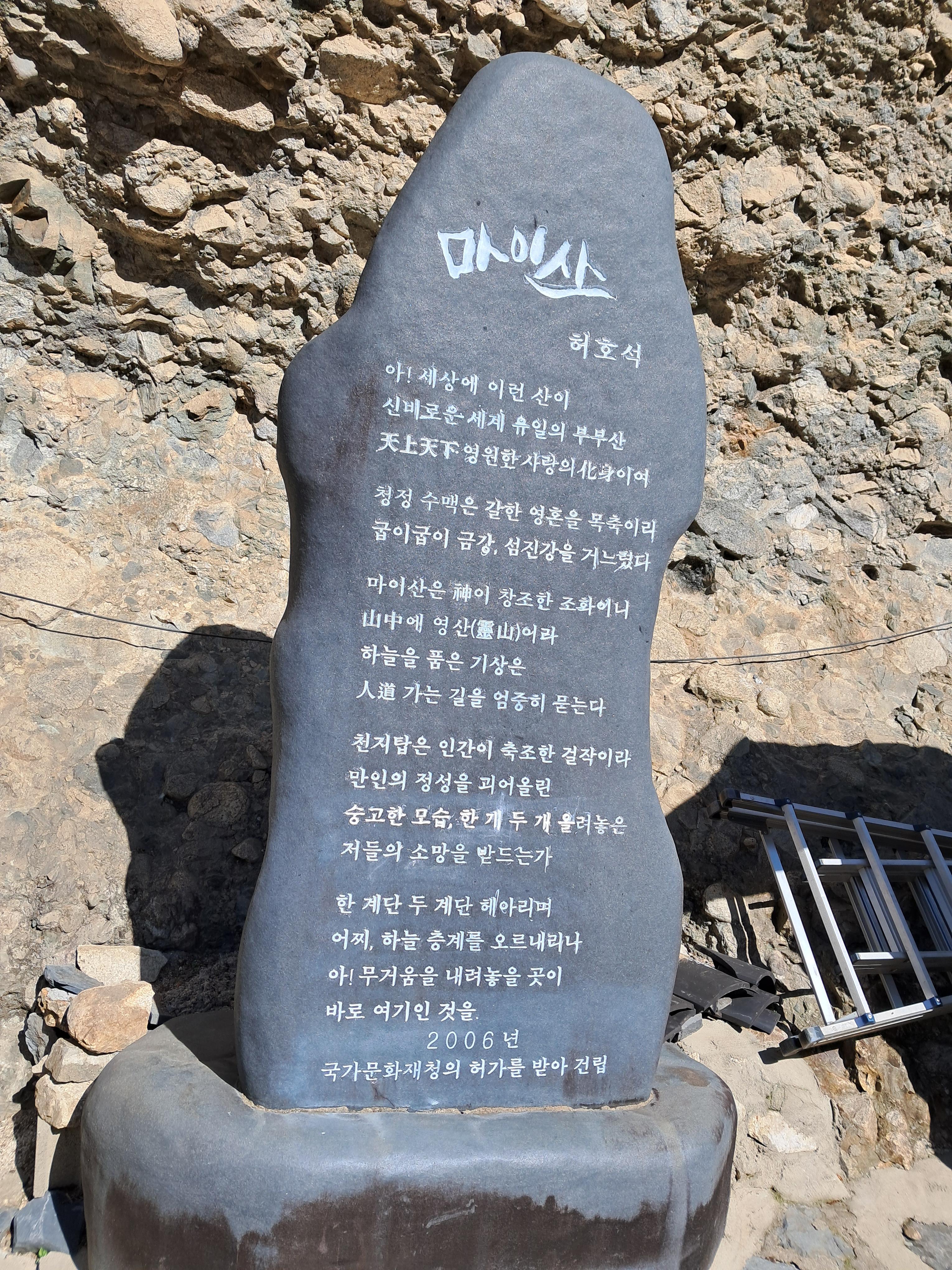 전북특별자치도 진안군 진안고원에 있는 2개의 암봉. 산의 모양이 말의 귀와 같다 하여 마이산이라 부른다.