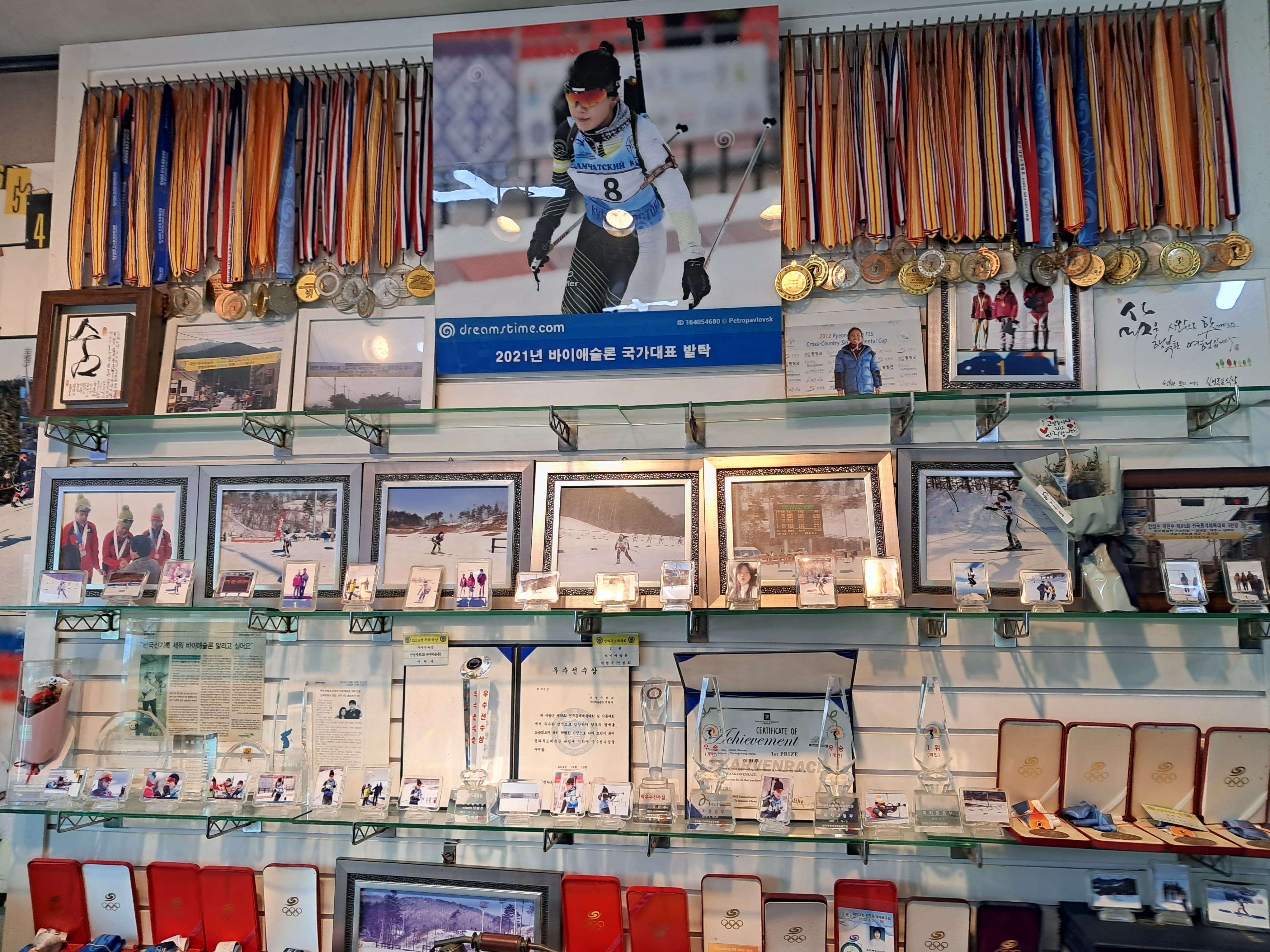 이 집 딸이 스키국가대표를 했다고 한다 많은 메달과 장장이 보인다