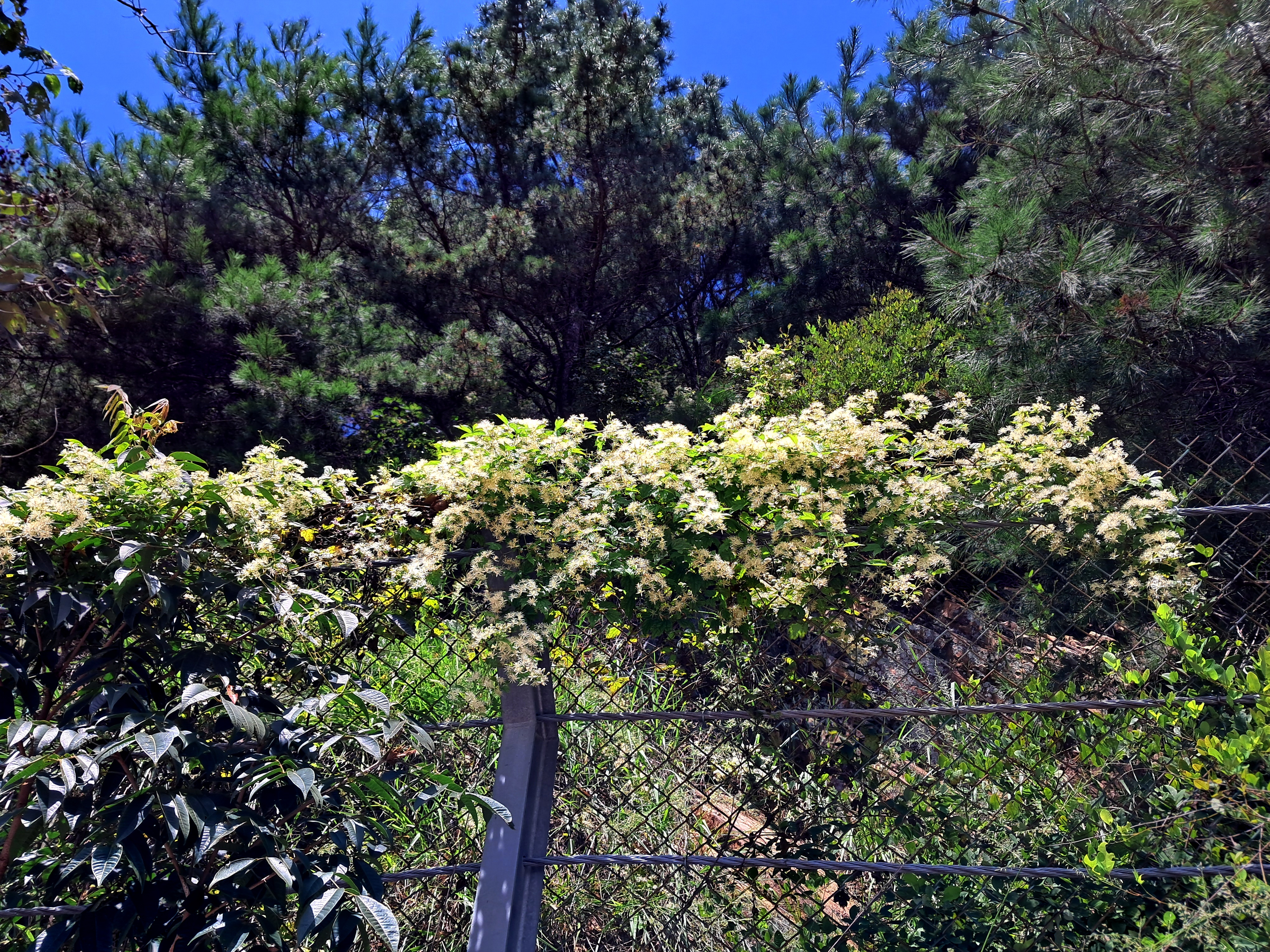 주차장부근의 휀스에 사위질빵의 꽃이 피어 있는 모습이다
