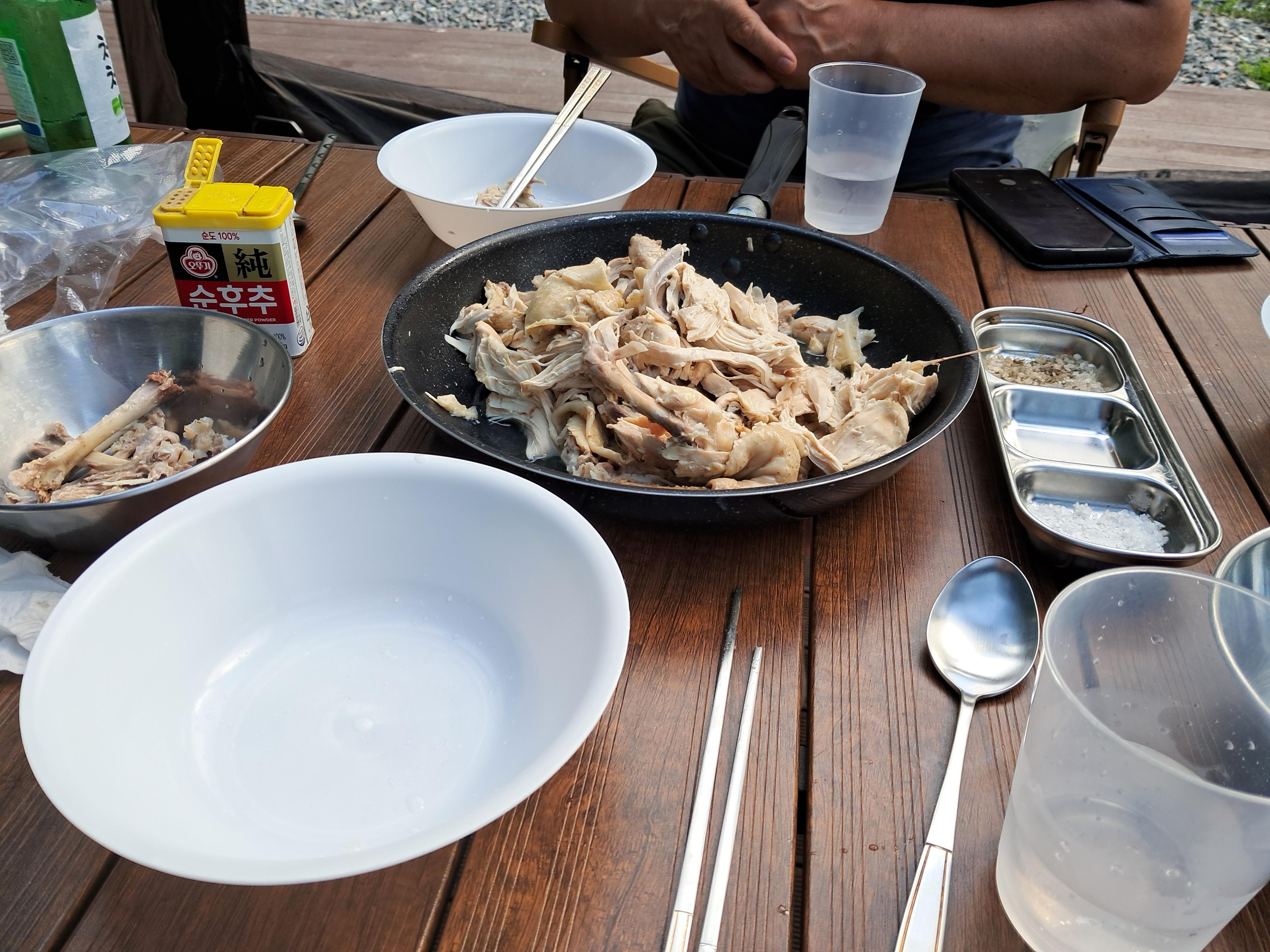 점심시간이 조금 늦었는데 닭을 삶아서 소주 한잔을 하며 점심 겸 자력으로 닭죽으로 때웠다