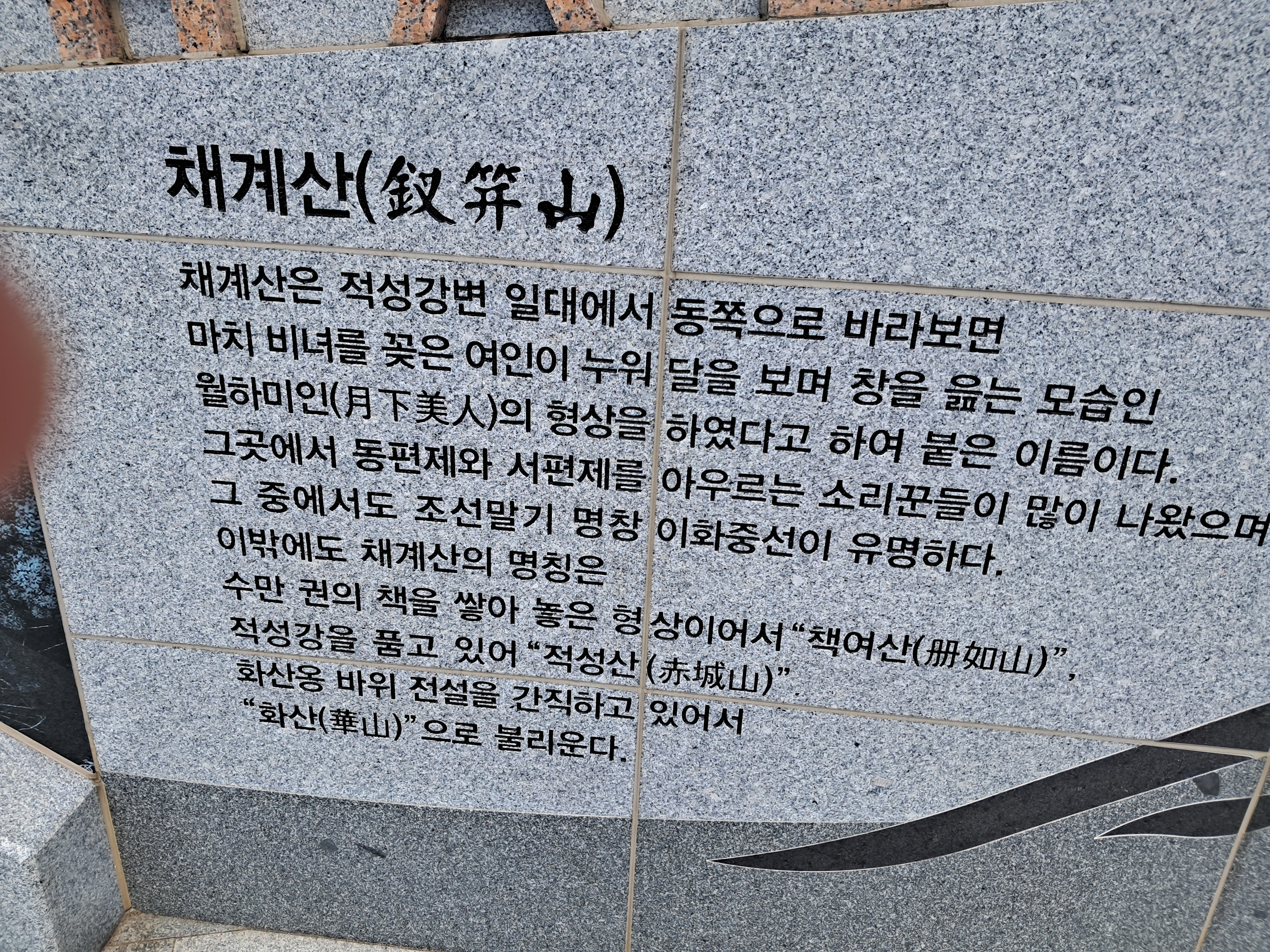 산 아래에는 맑은 섬진강이 흐르는 병풍처럼 아름다운 석산이다. 체계산 밑 적성강변에 천재지변에 따라