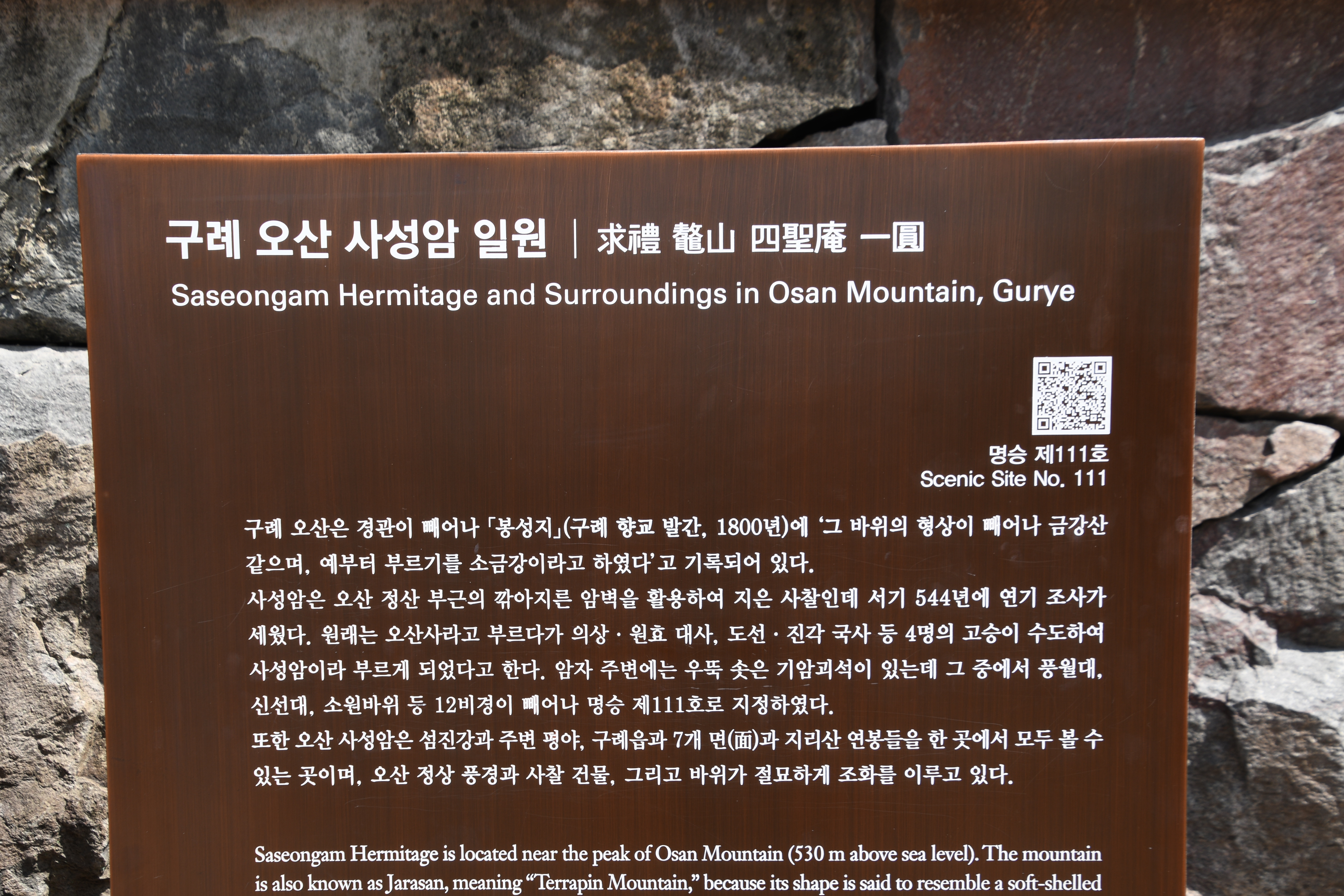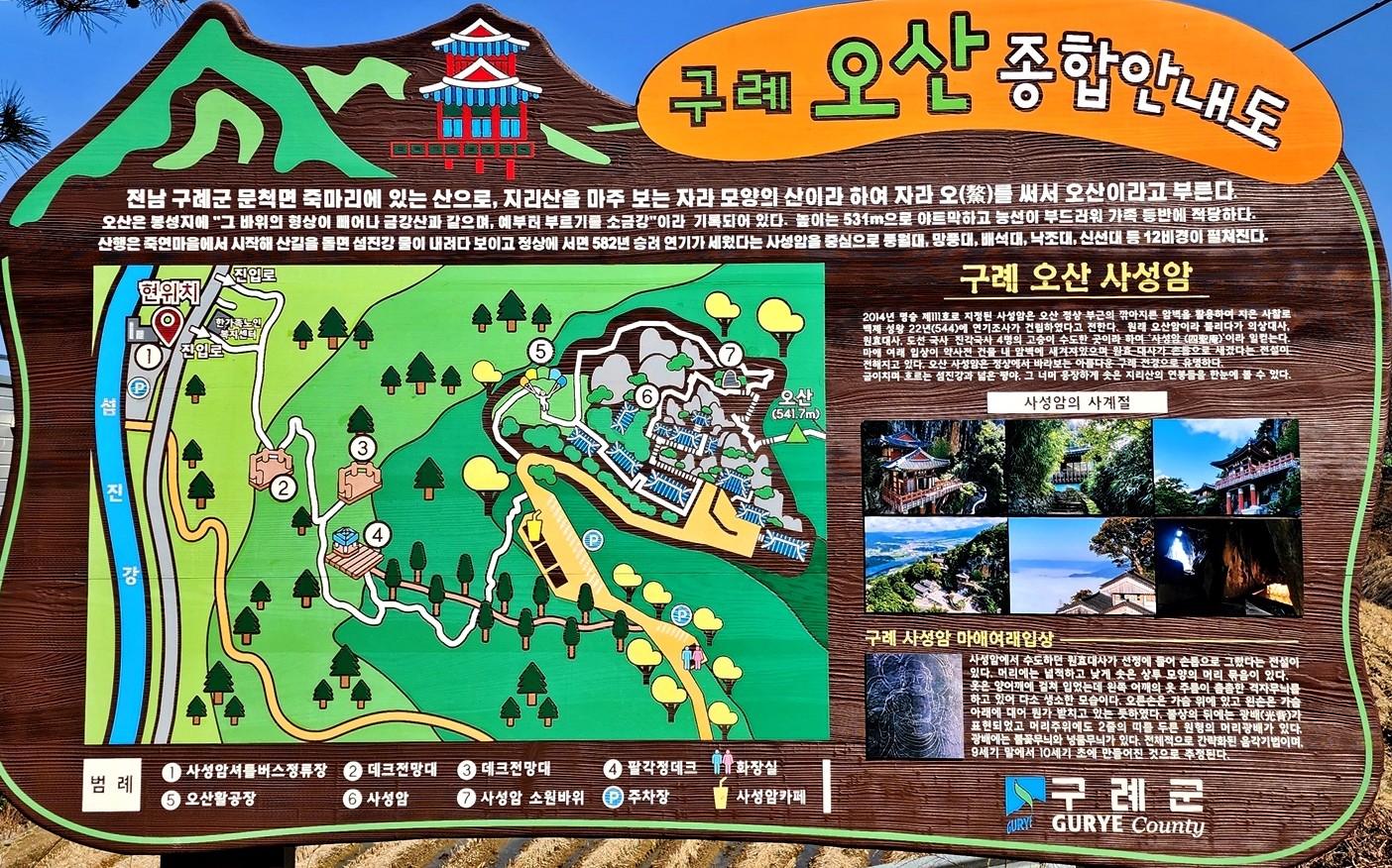 오산(鰲山)은 섬진강이 180도 휘어 감도는 구례의 진산이다.