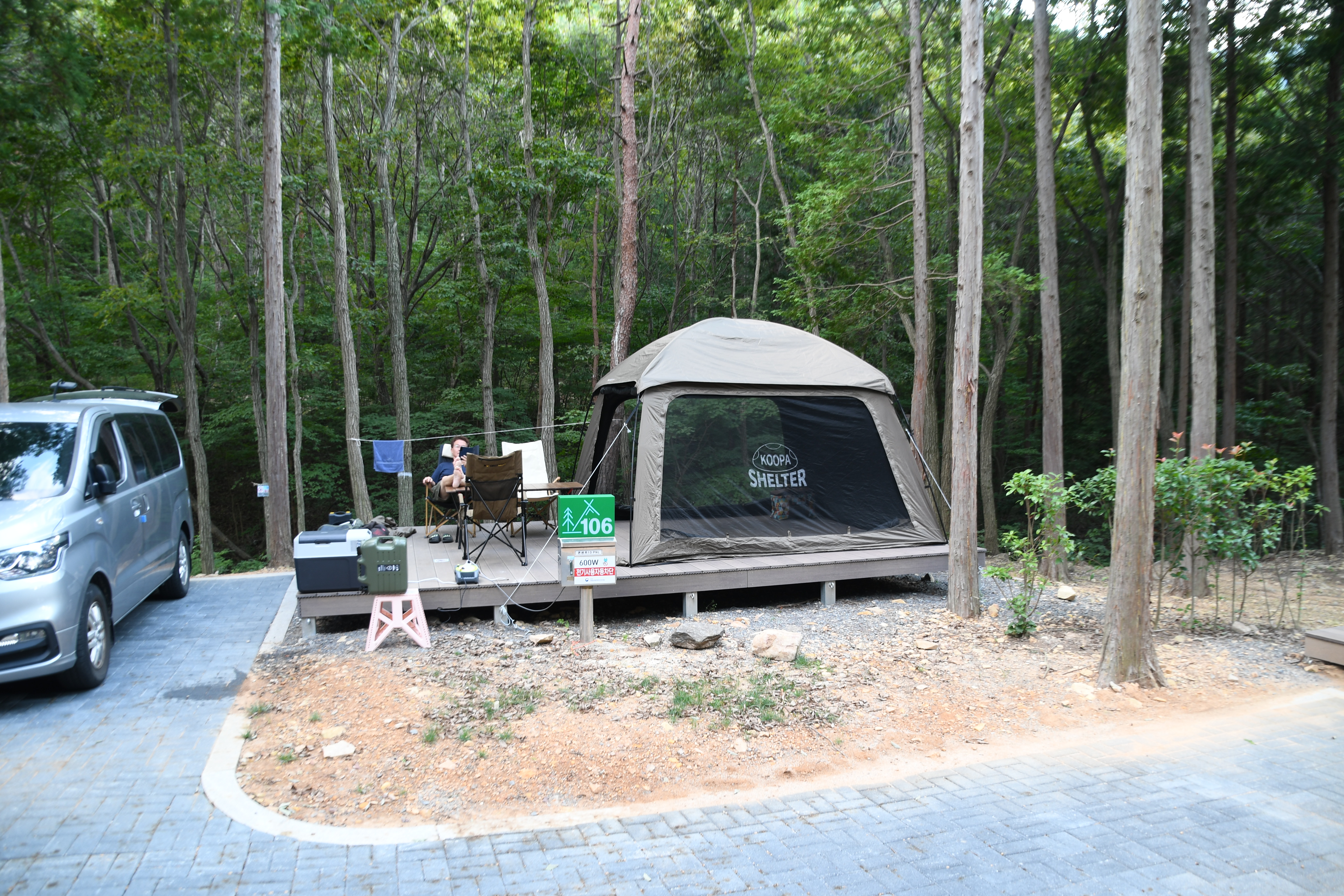계곡 쪽에 106번 데크가 우리 야영장소다 텐트를 치고 잠시 휴식을 취하고 있는 중이다