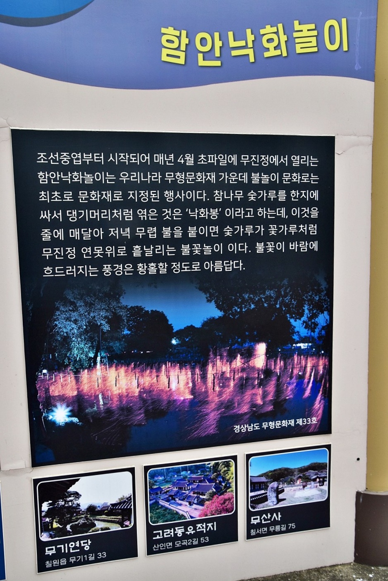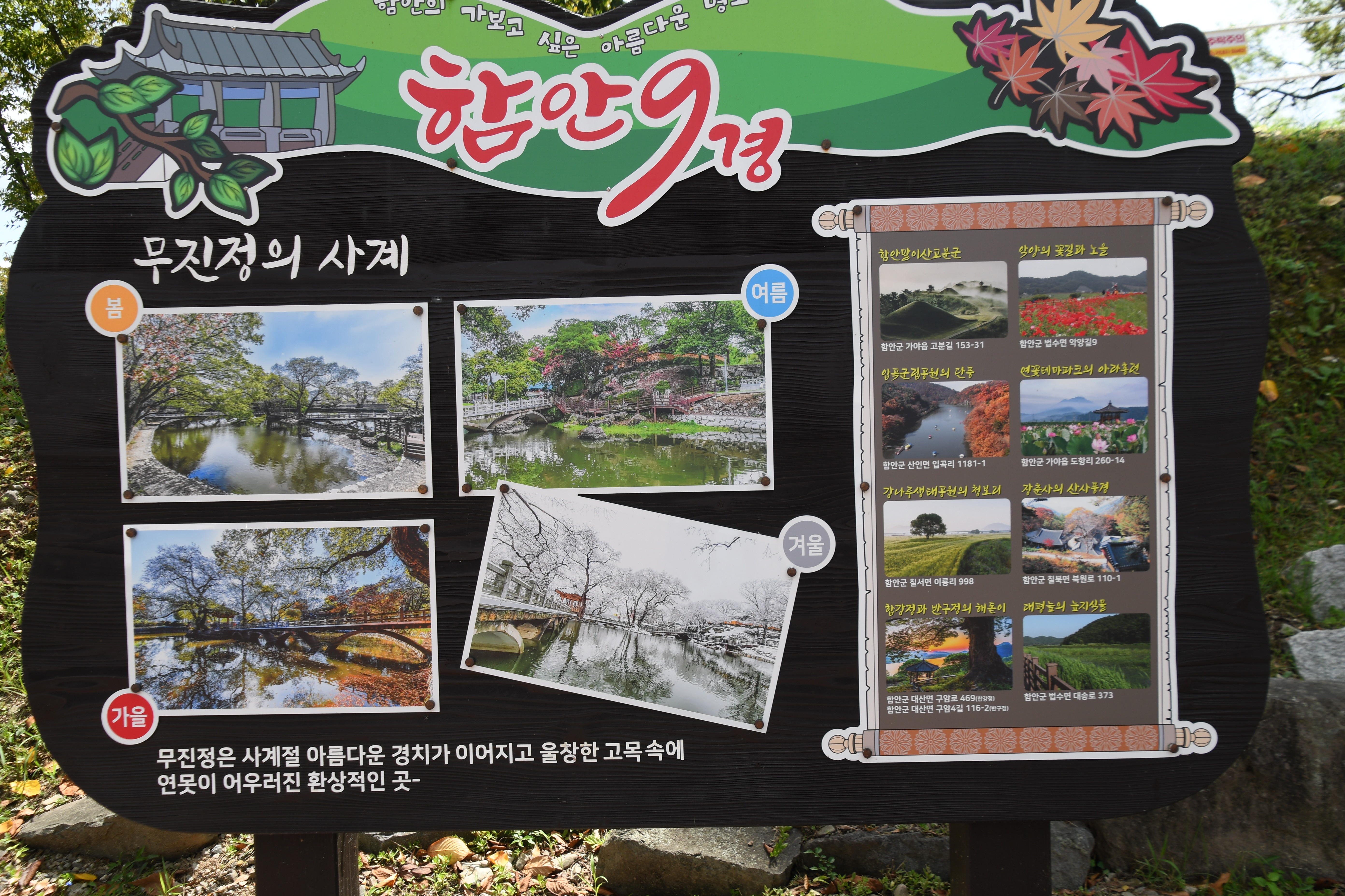 함안군에서 선정한 함안의 9경에는 말이산고분군. 악양의 꽃길과 해넘이, 입곡군립공원의 단풍, 무진정의 사계,
