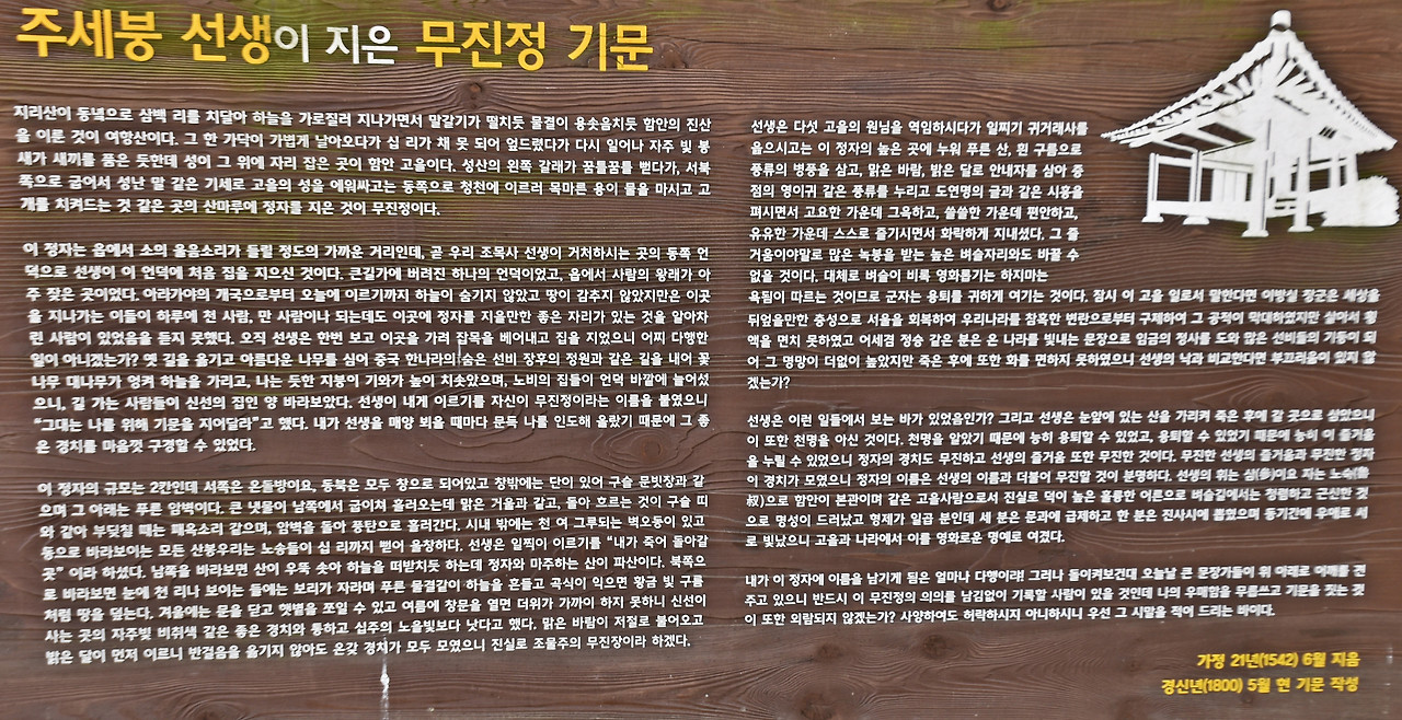 이 정자는 조선 명종 22년(1567)에 무진(無盡) 조삼(趙參) 선생의 덕을 추모하기 위해 그의 후손들이 세우고,