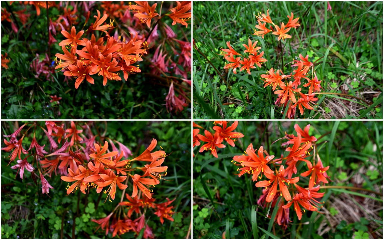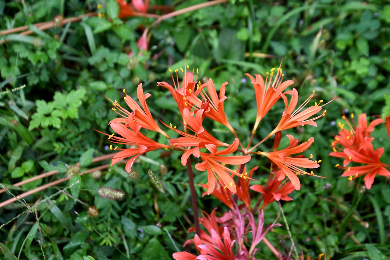 9월에 꽃대머리에 산형꽃차례로 4~5개의 붉은 꽃이 커다랗게 핀다.