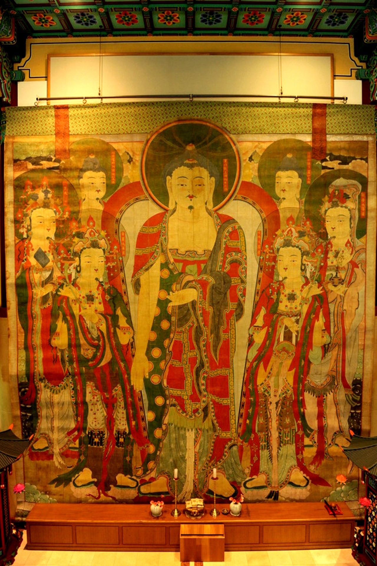 이에 따르면 주존은 '영산교주석가모니불(靈山敎主釋迦牟尼佛)', 상단에 대칭으로 나타나는 두 여래는 '증청묘법다
