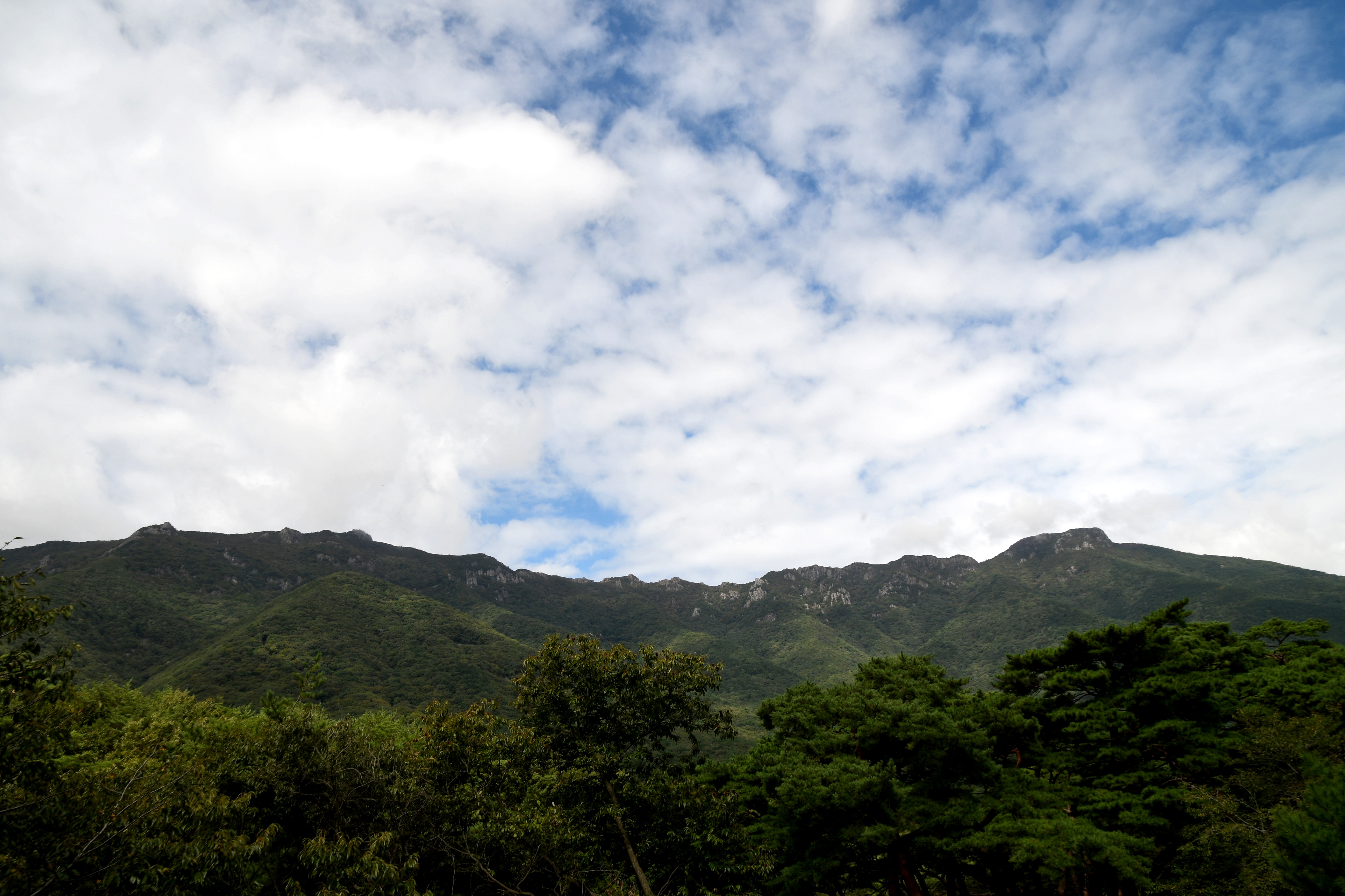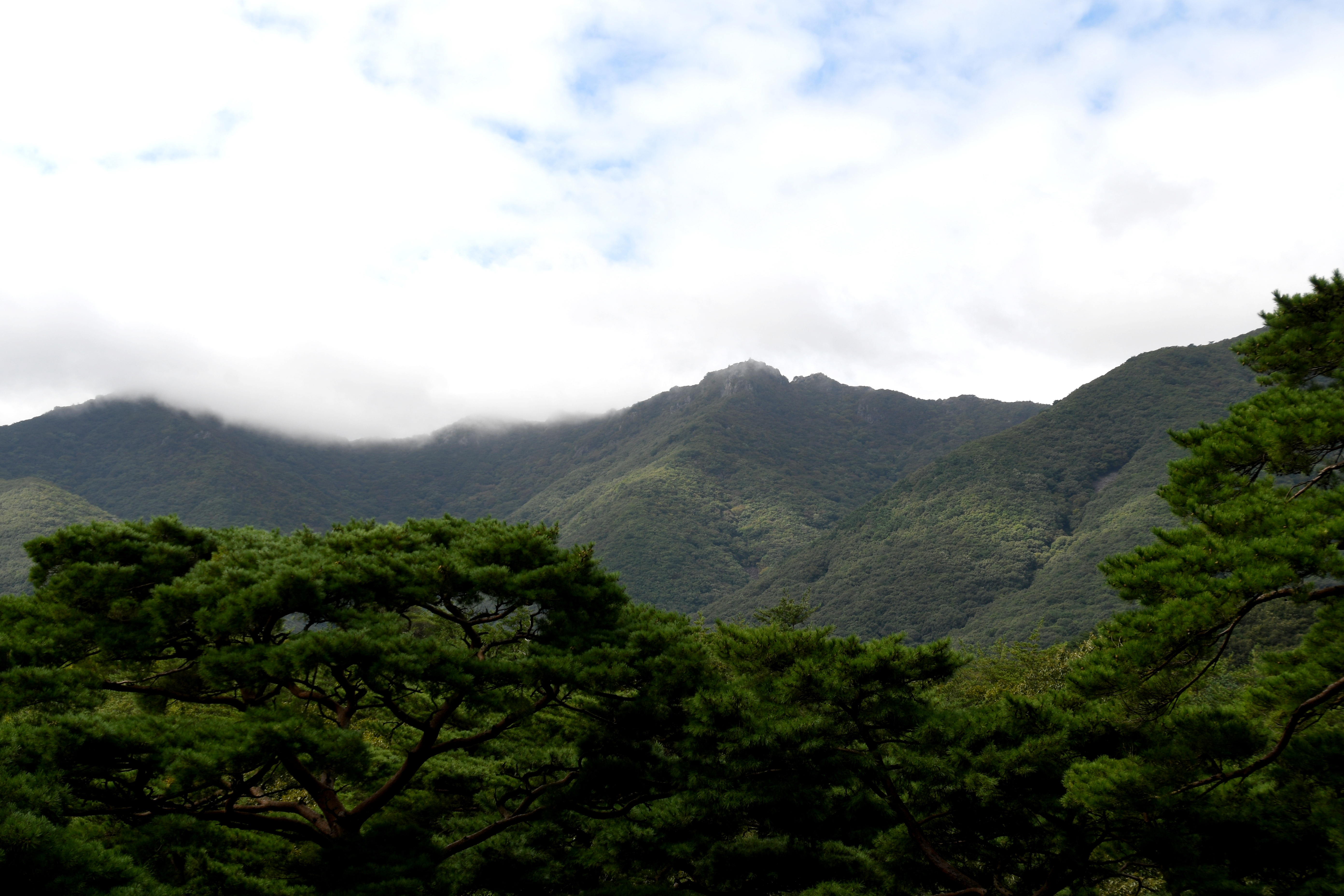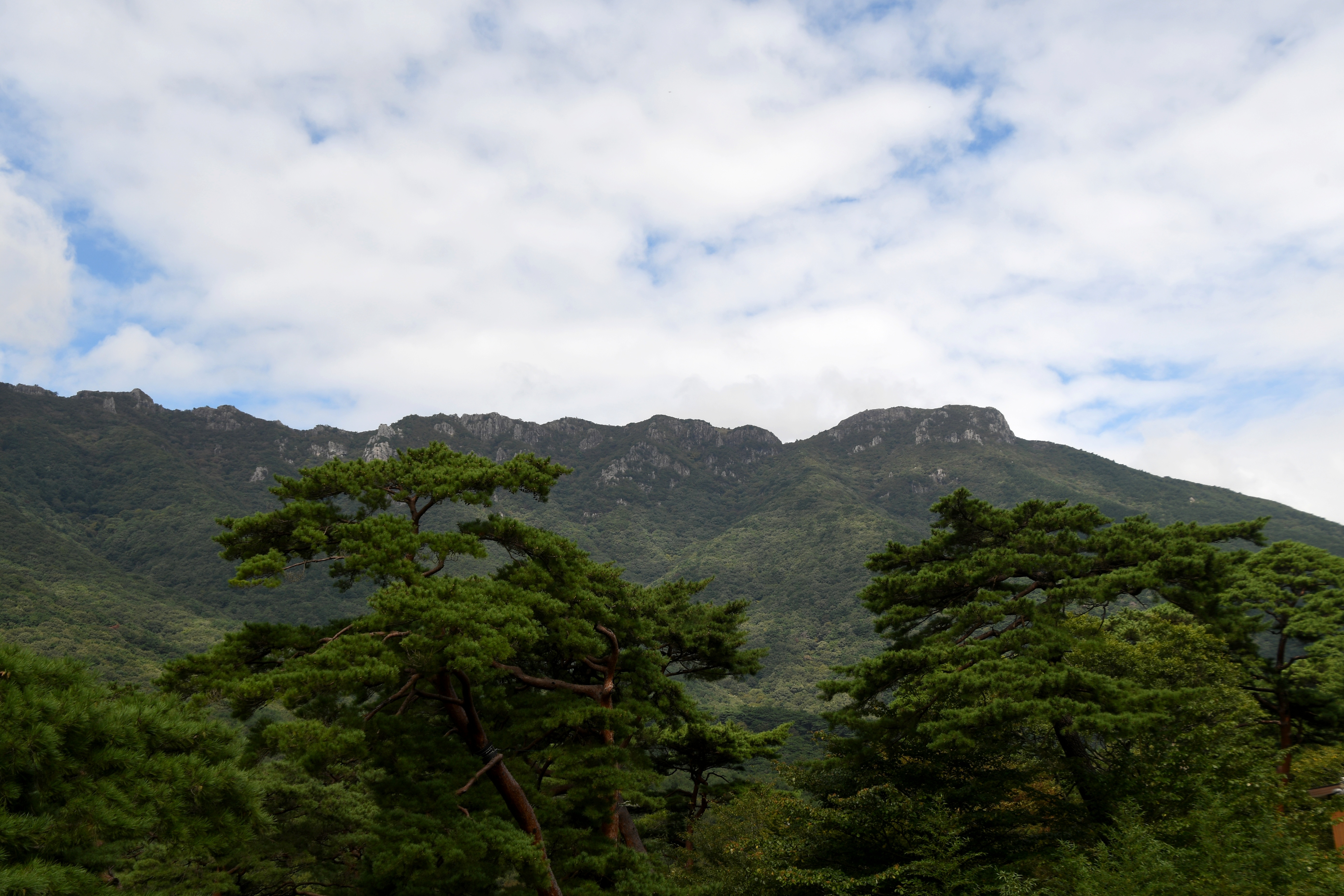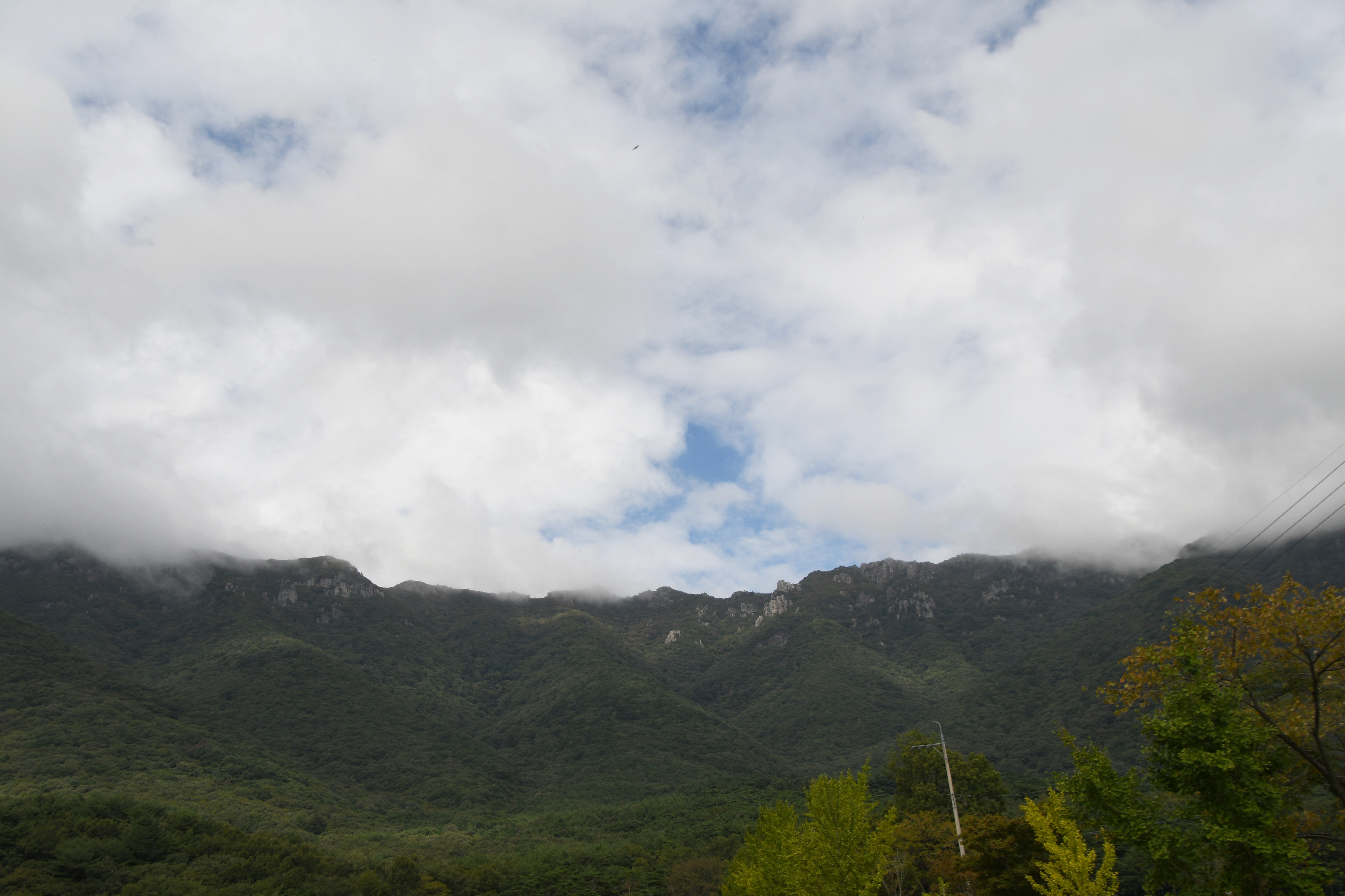 주차장에서 바라본 영축산능선 구름이 조금씩 걷히고 있다