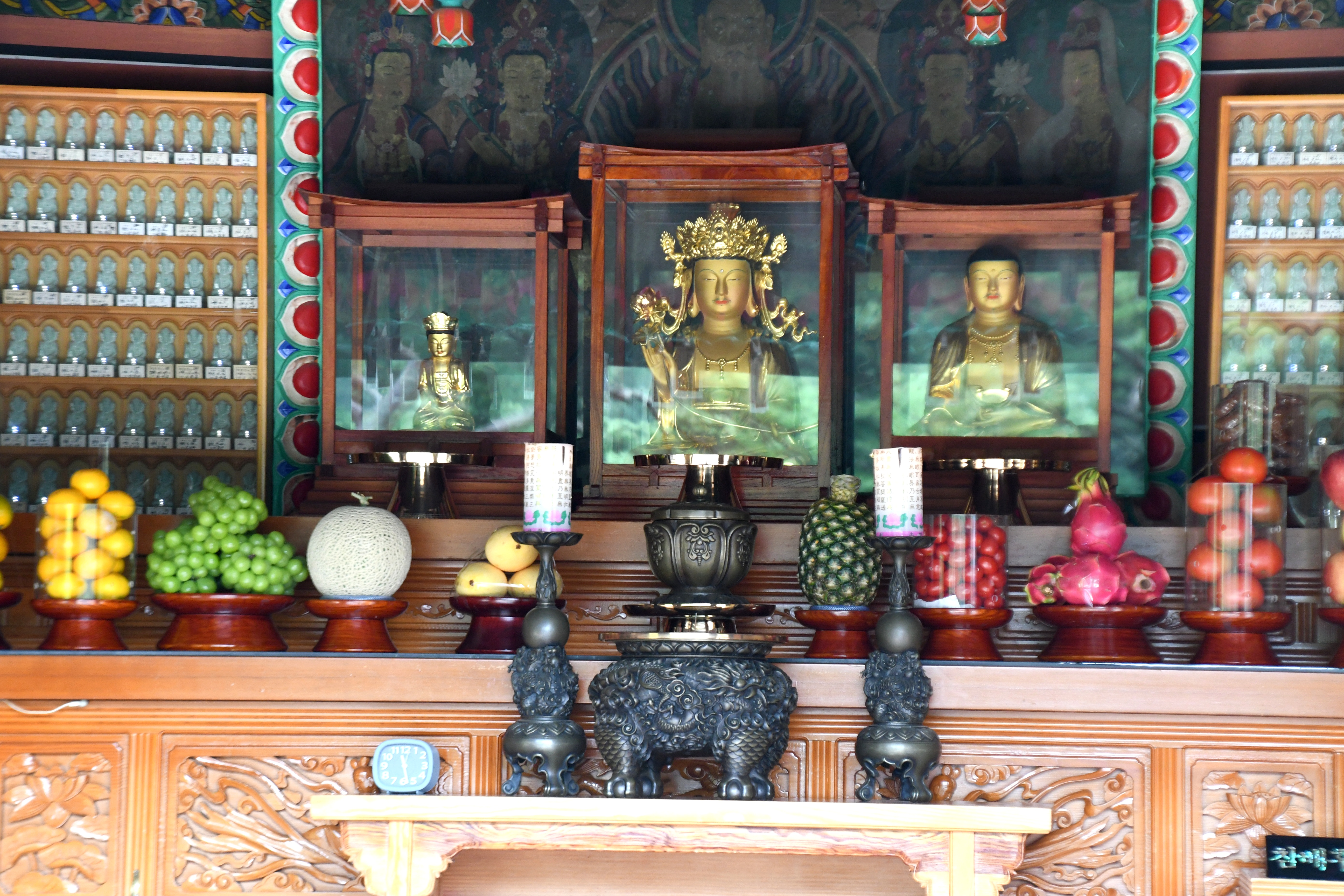 야외에 계신 부처님께 공양을 올릴 수 있도록 본존불과 비슷한 재질의 암석으로 만든 낮은 불단도 있다.