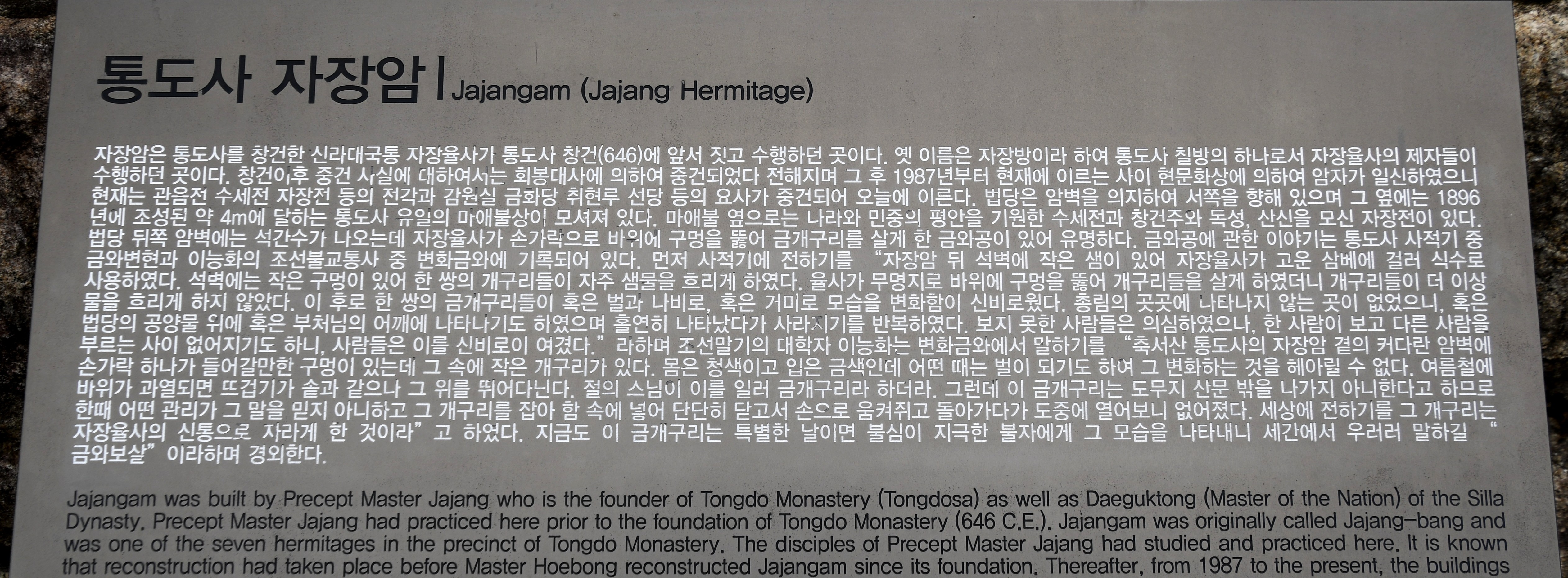 자장암은 통도사의 창건주 자장율사가 수도 하던 곳이다. 창건연대는 미상이나 회봉대사에 의하여