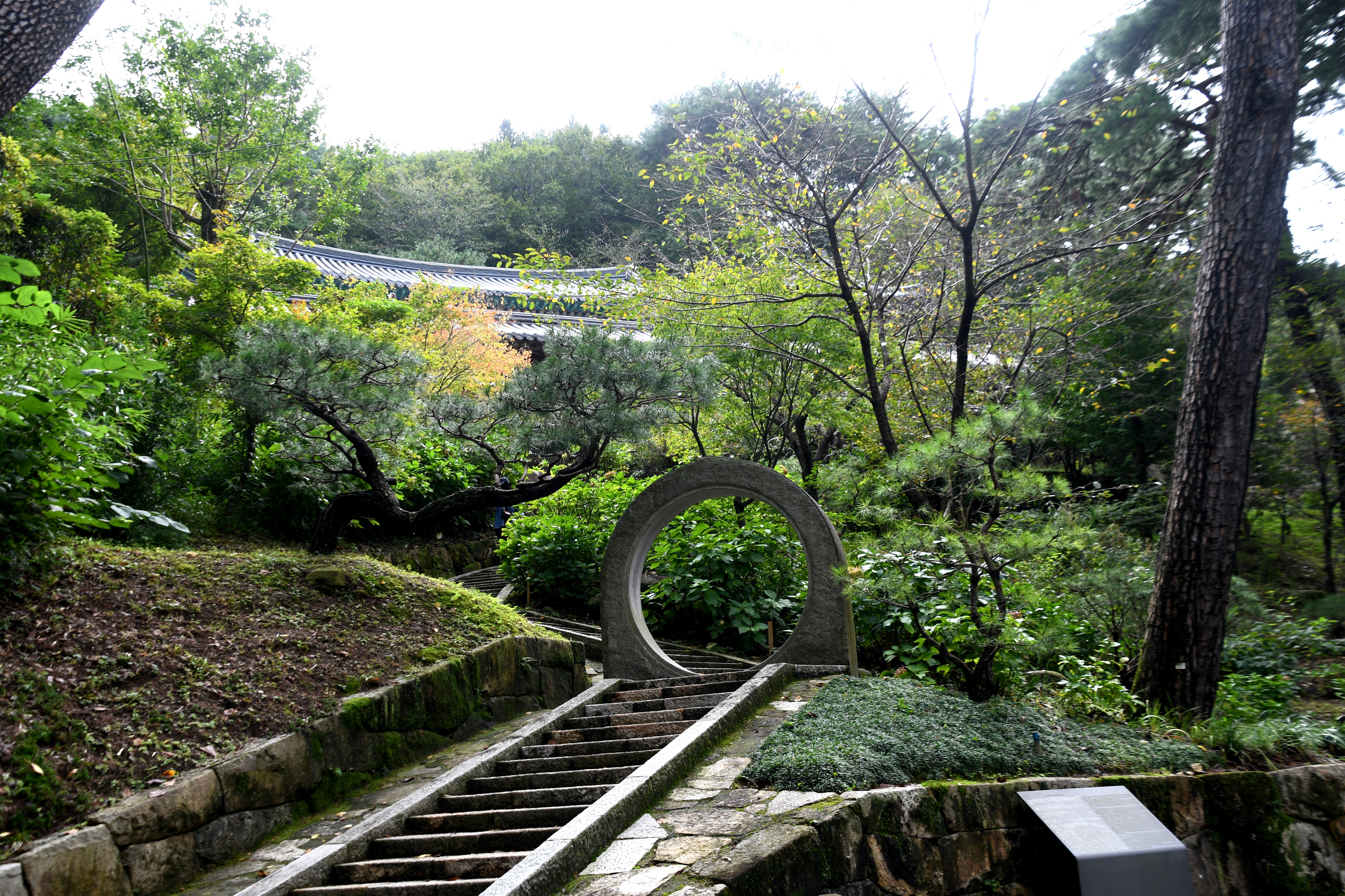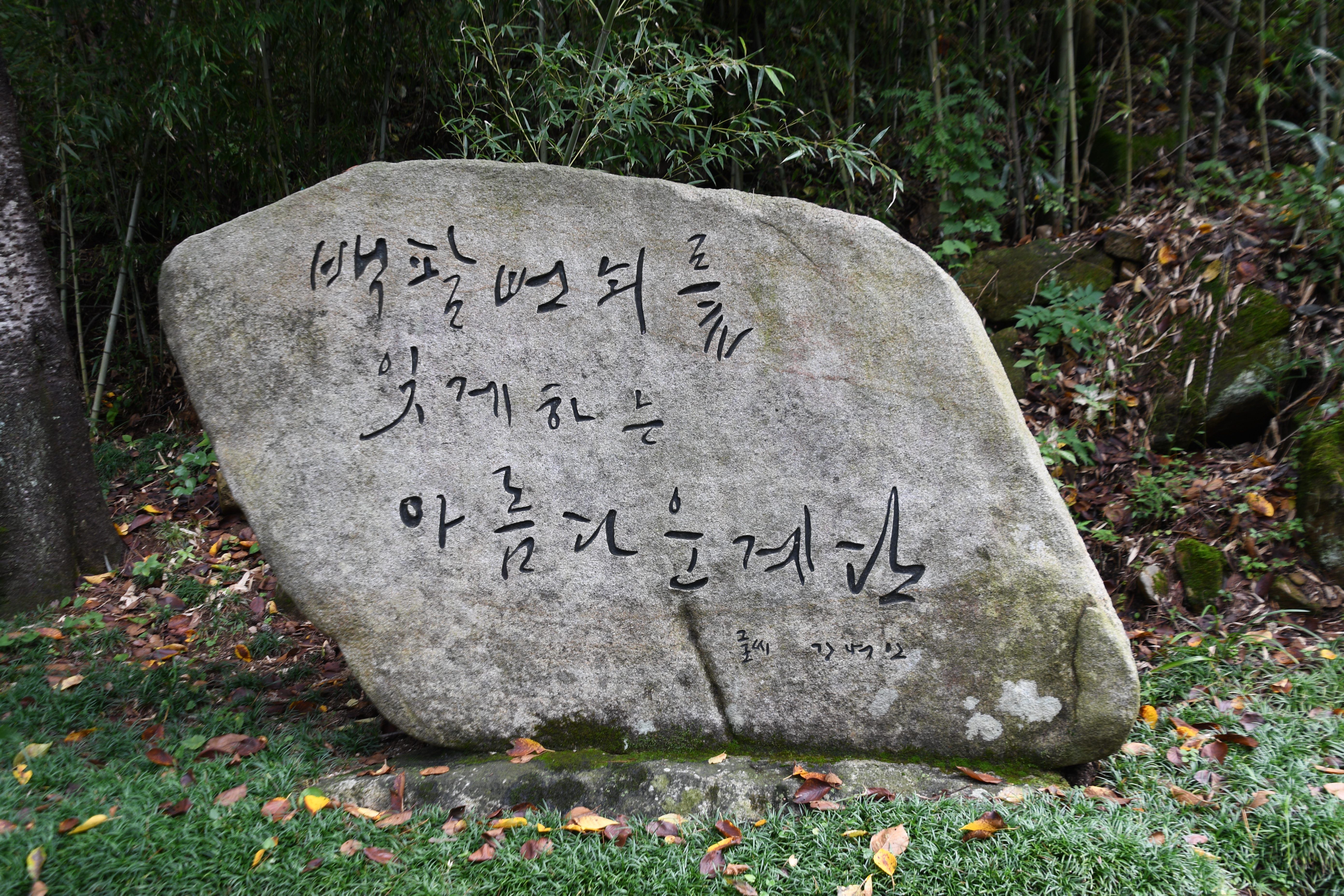 자장암으로 오르는 계단 백팔번뇌를 잊게 하는 아름다운 계단이란 표지석이 보인다