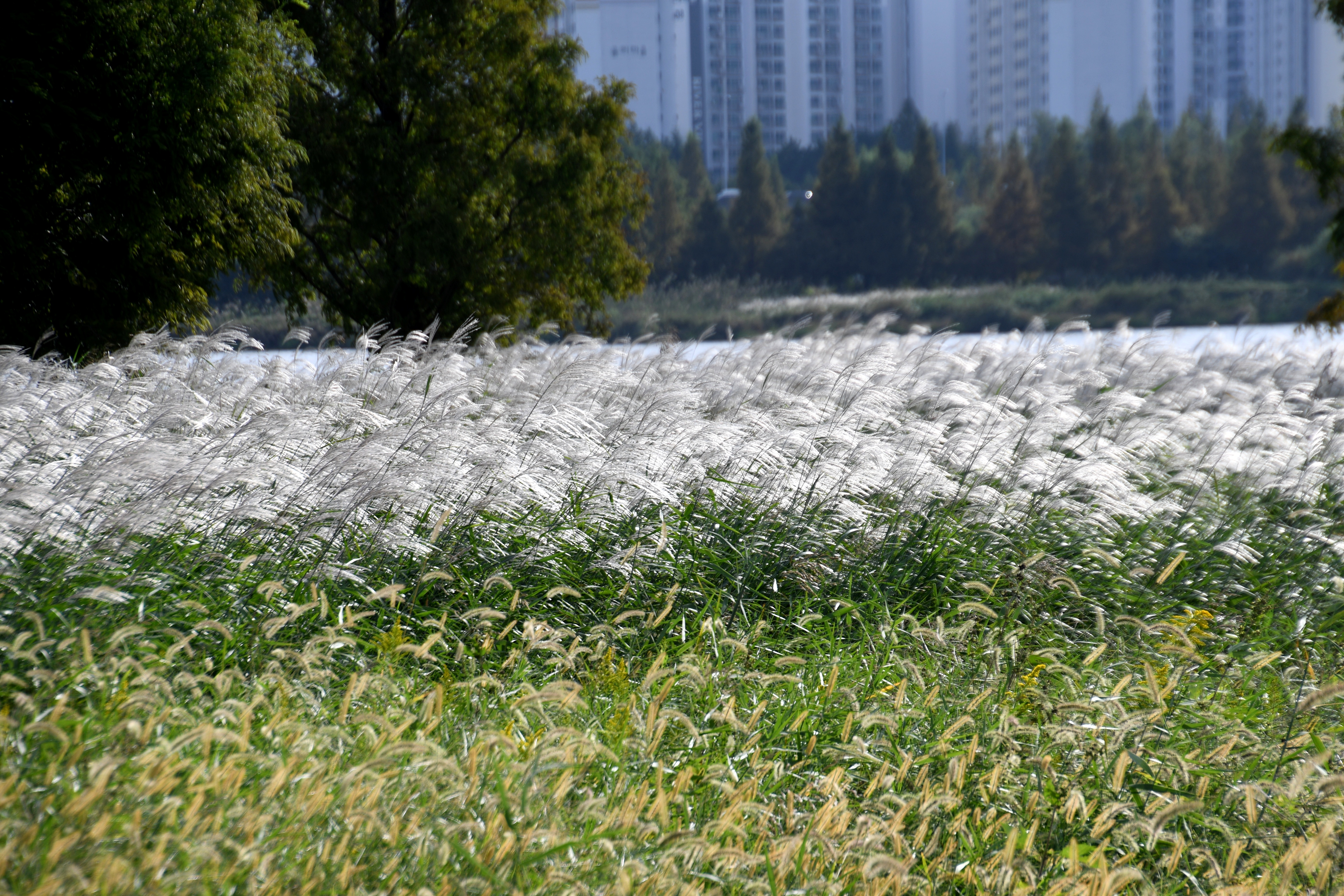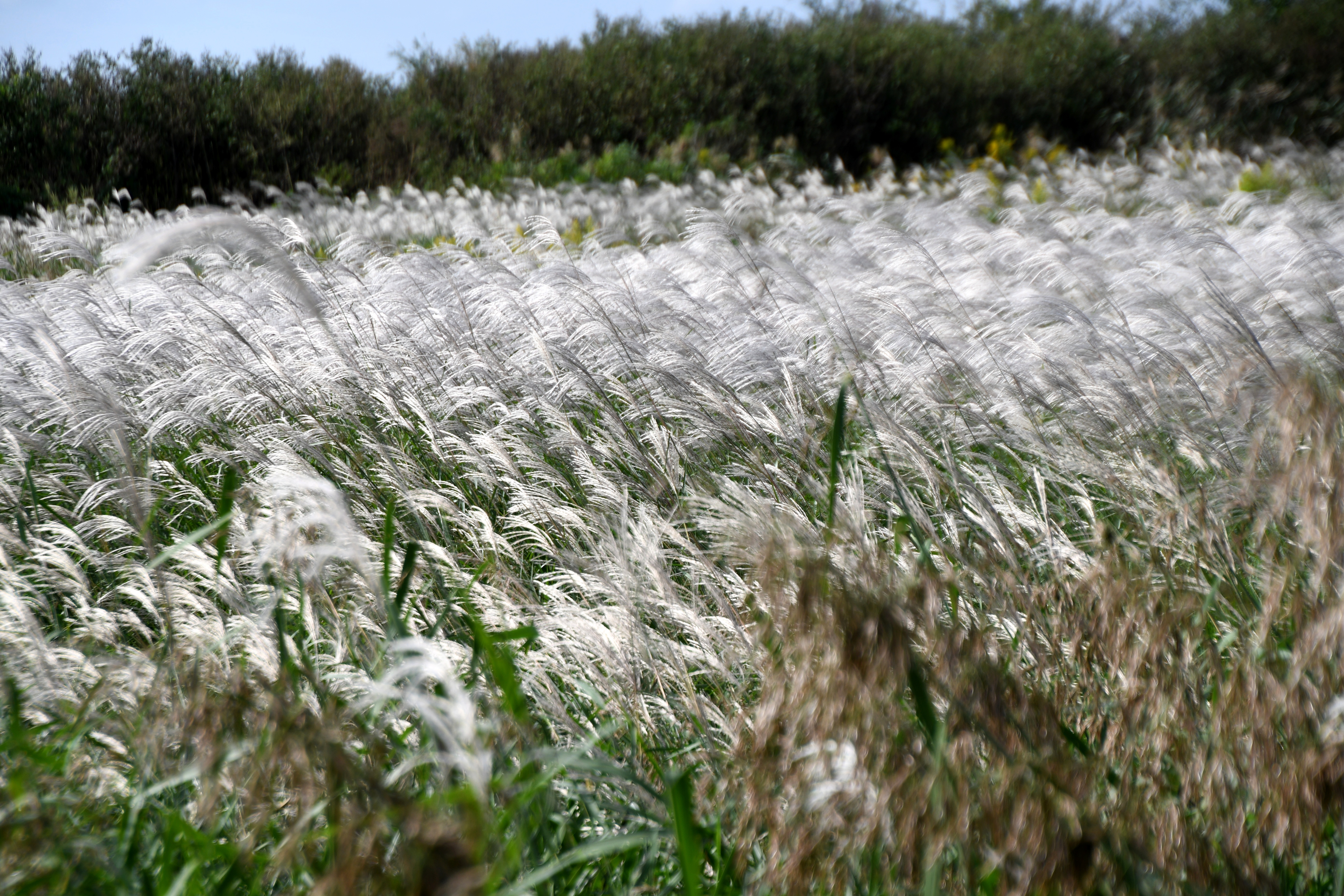 은빛 물억새가 바람이 너무 심하게 불어 거의 누워 있는 모습이다