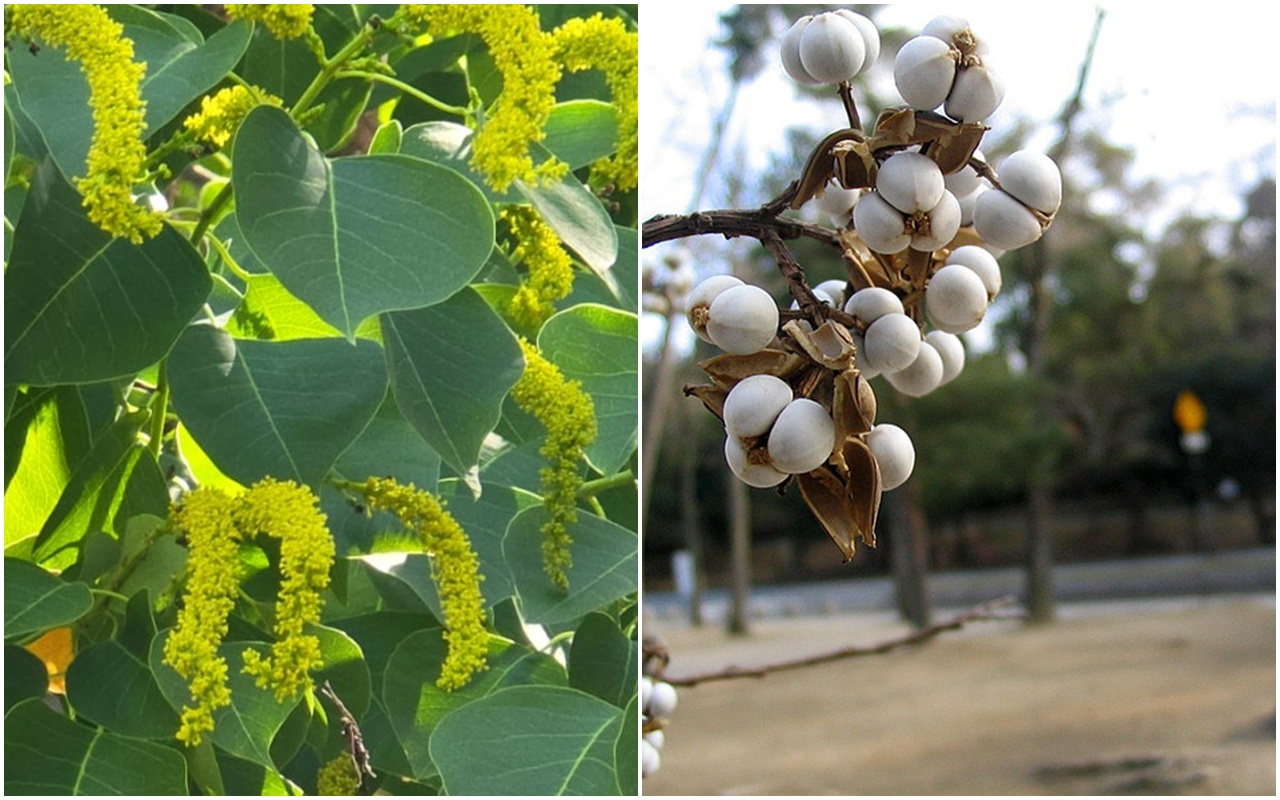 암수딴그루이며 가지 끝이나 잎겨드랑이에서 원추꽃차례로 달리는데 일부 총상꽃차례로 달리기도 한다.