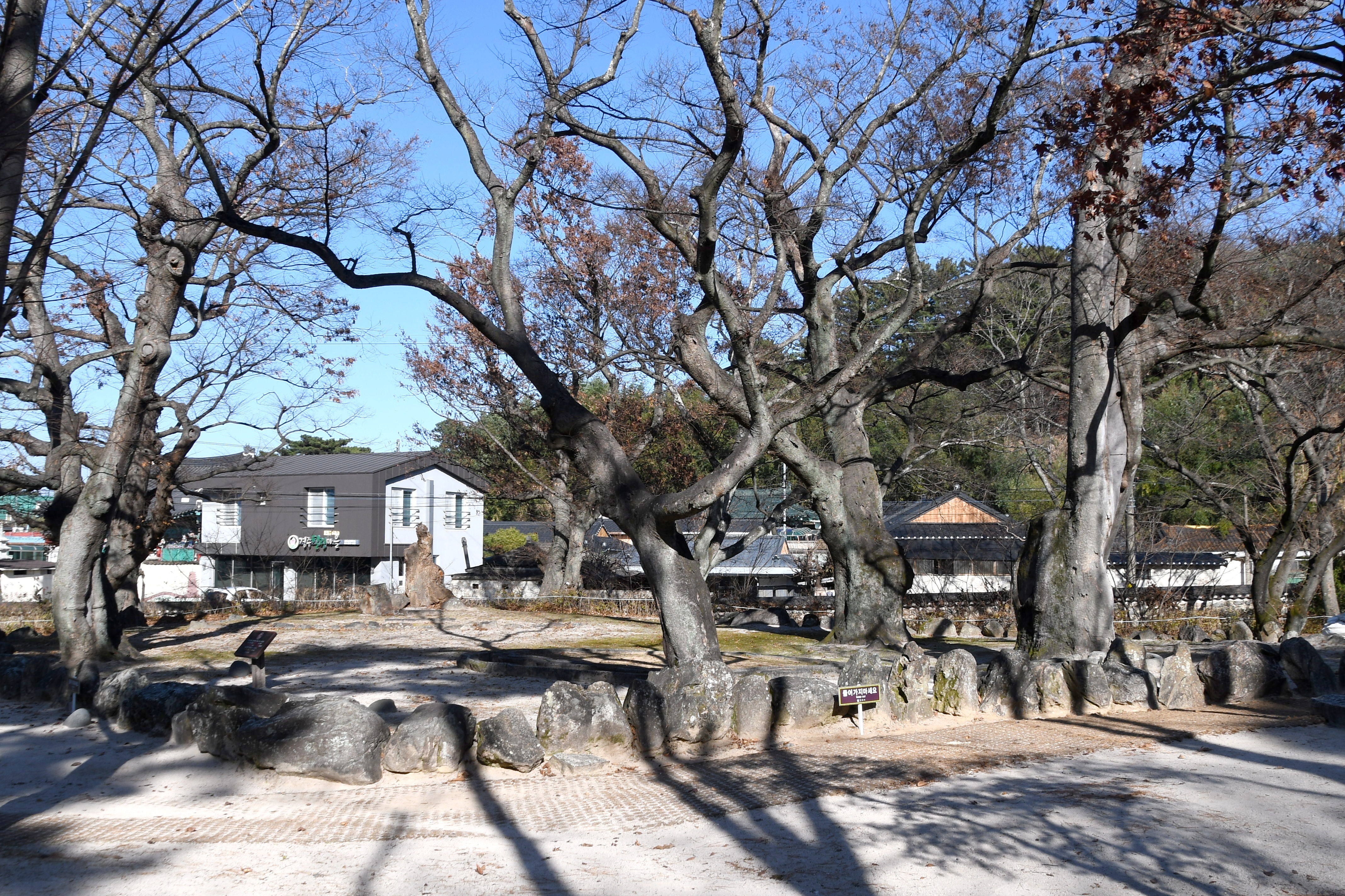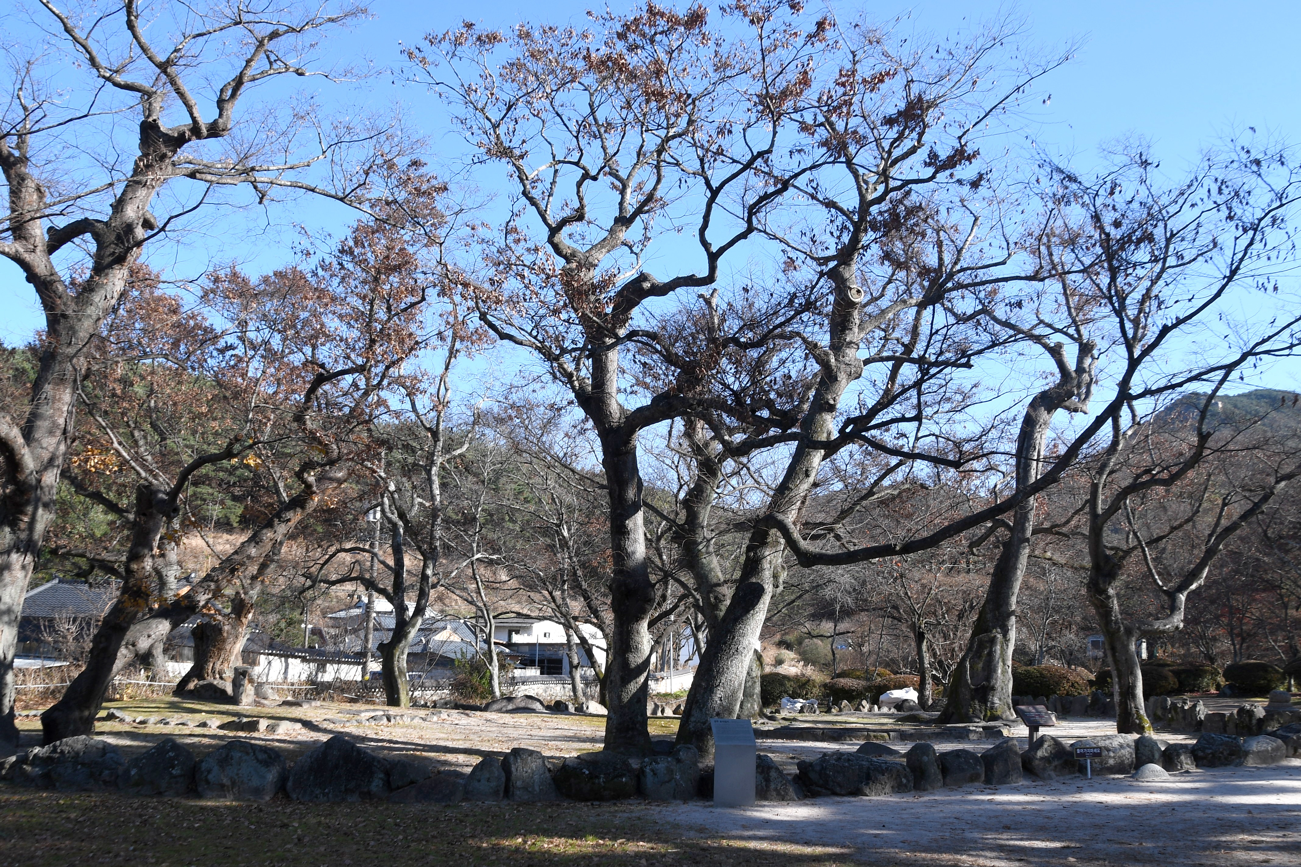 포석정을 둘러싸고 있는 느티나무(팽나무로 보인다)는 잎이 다 떨어지고 앙상한 나목만 쓸쓸한 모습으로 서 있다