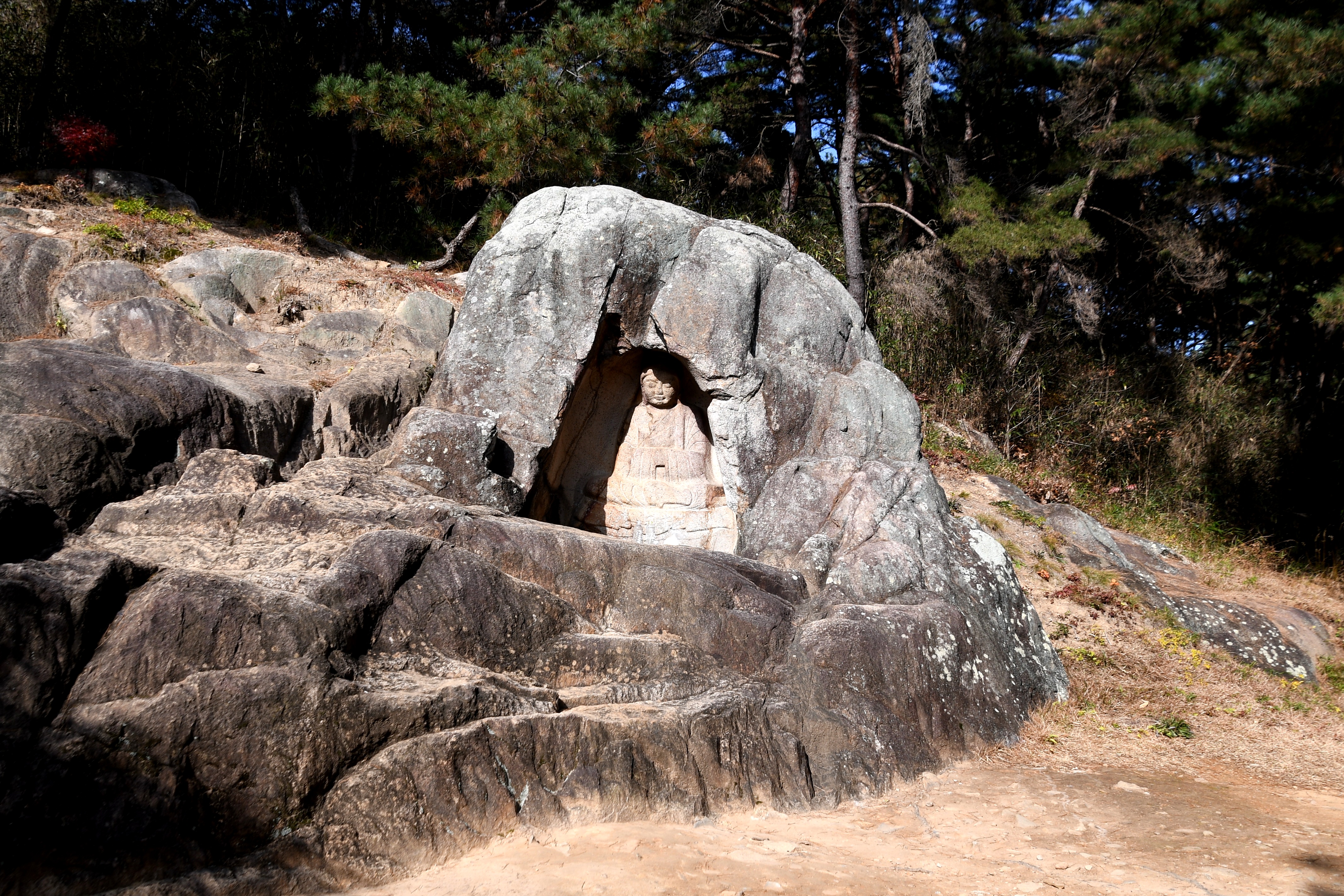 이 석불좌상은 높이 3m, 폭 4m 정도 되는 바위에 감 실을 파고 그 안에 고부조로 새긴 것인데, 감 실은 입구가