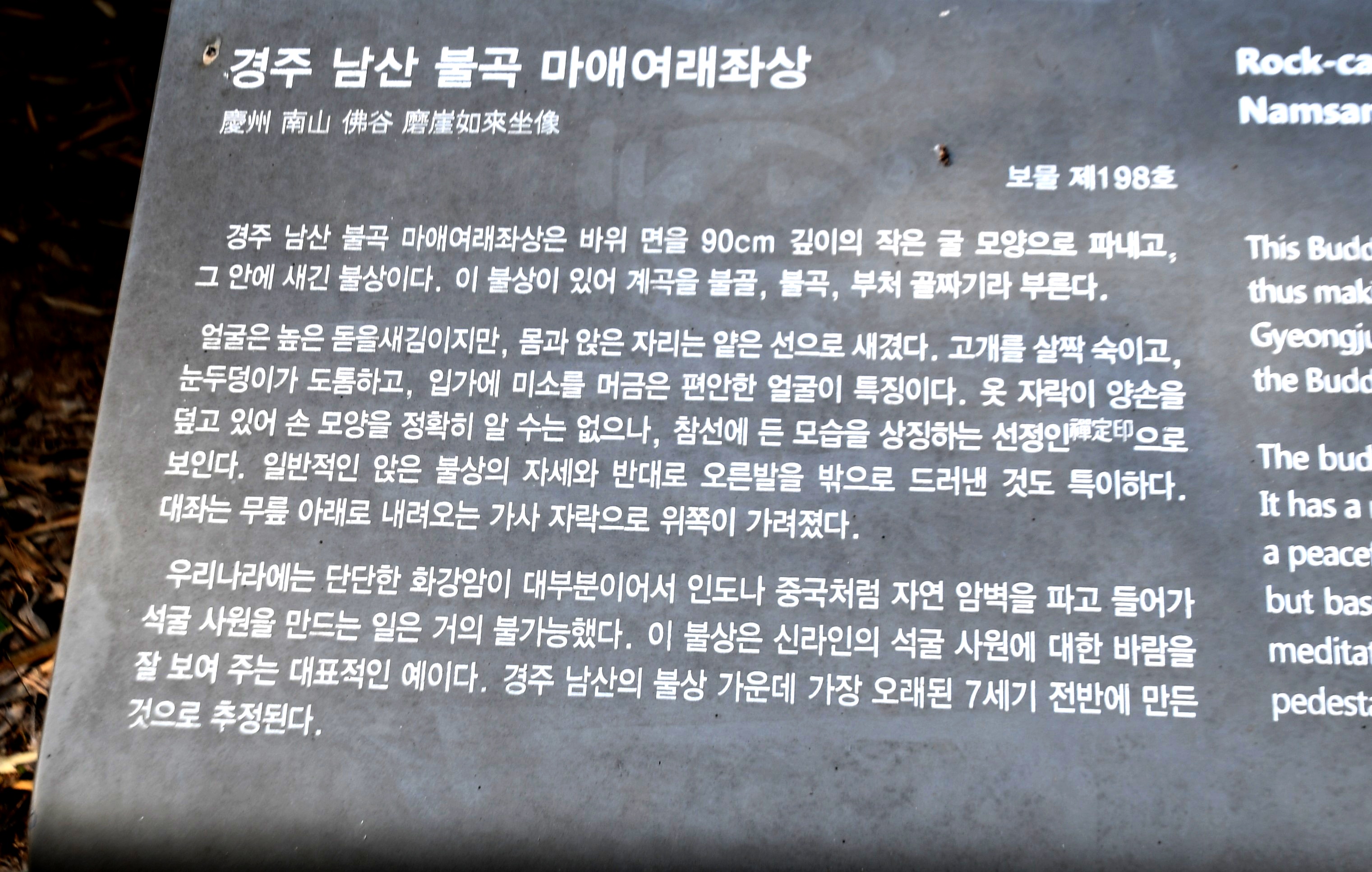 고신라에 만들어져서 요즘 보는 일반적인 부처상과는 다른 모습을 띠고 있고 바위를 깎아서 감 실을 만들고