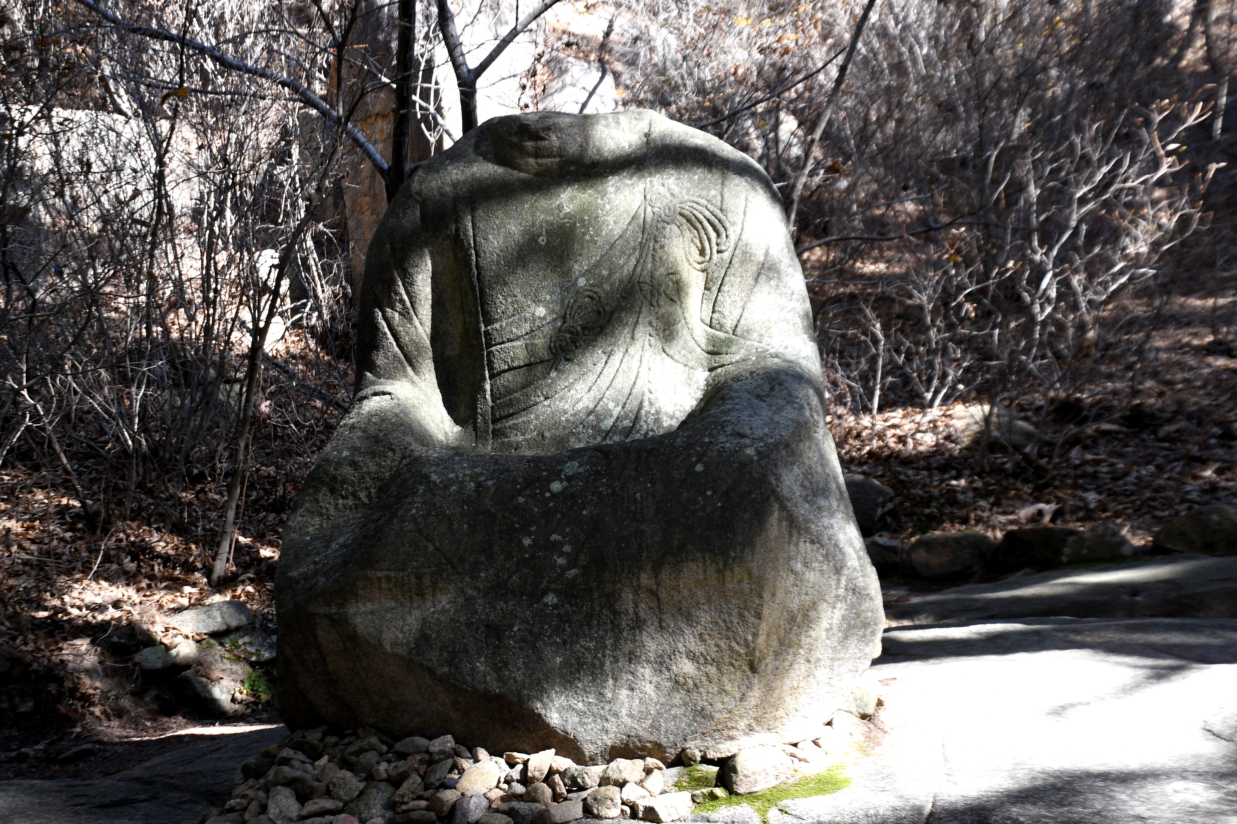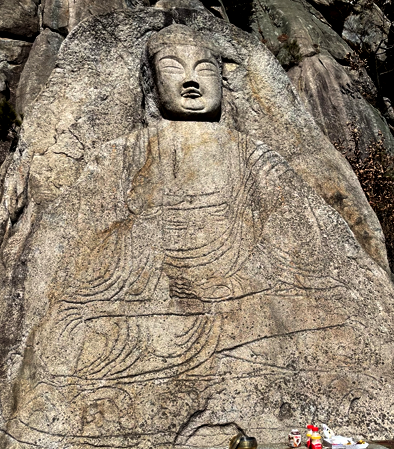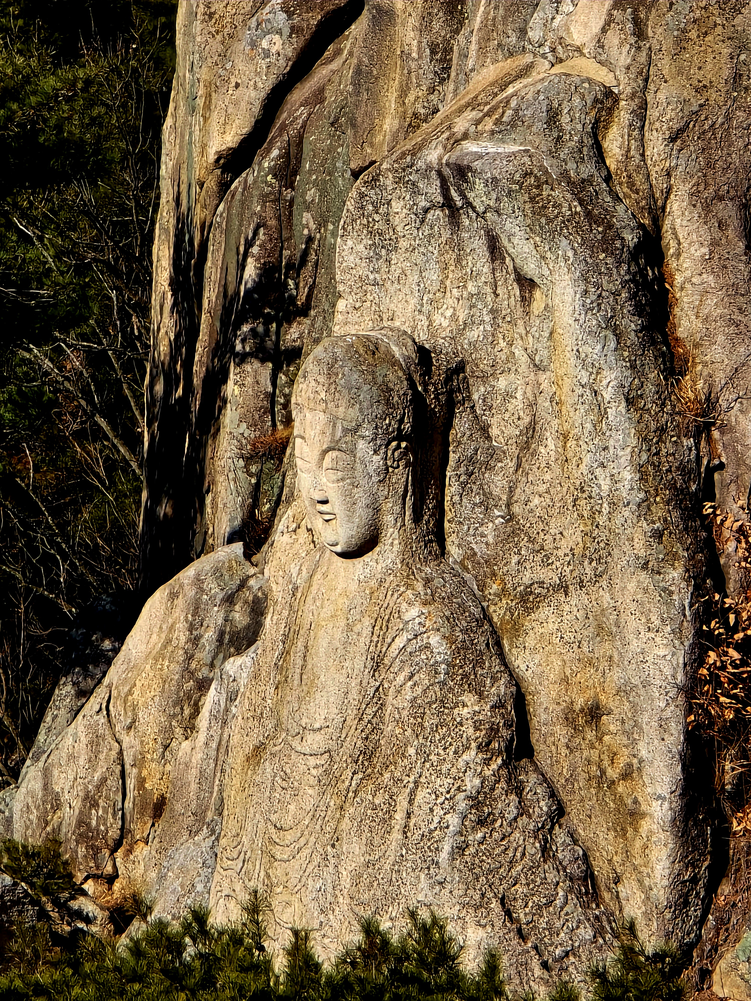 거대한 자연석에 조각되어 선각임에도 당당한 불신에 위엄이 느껴진다.