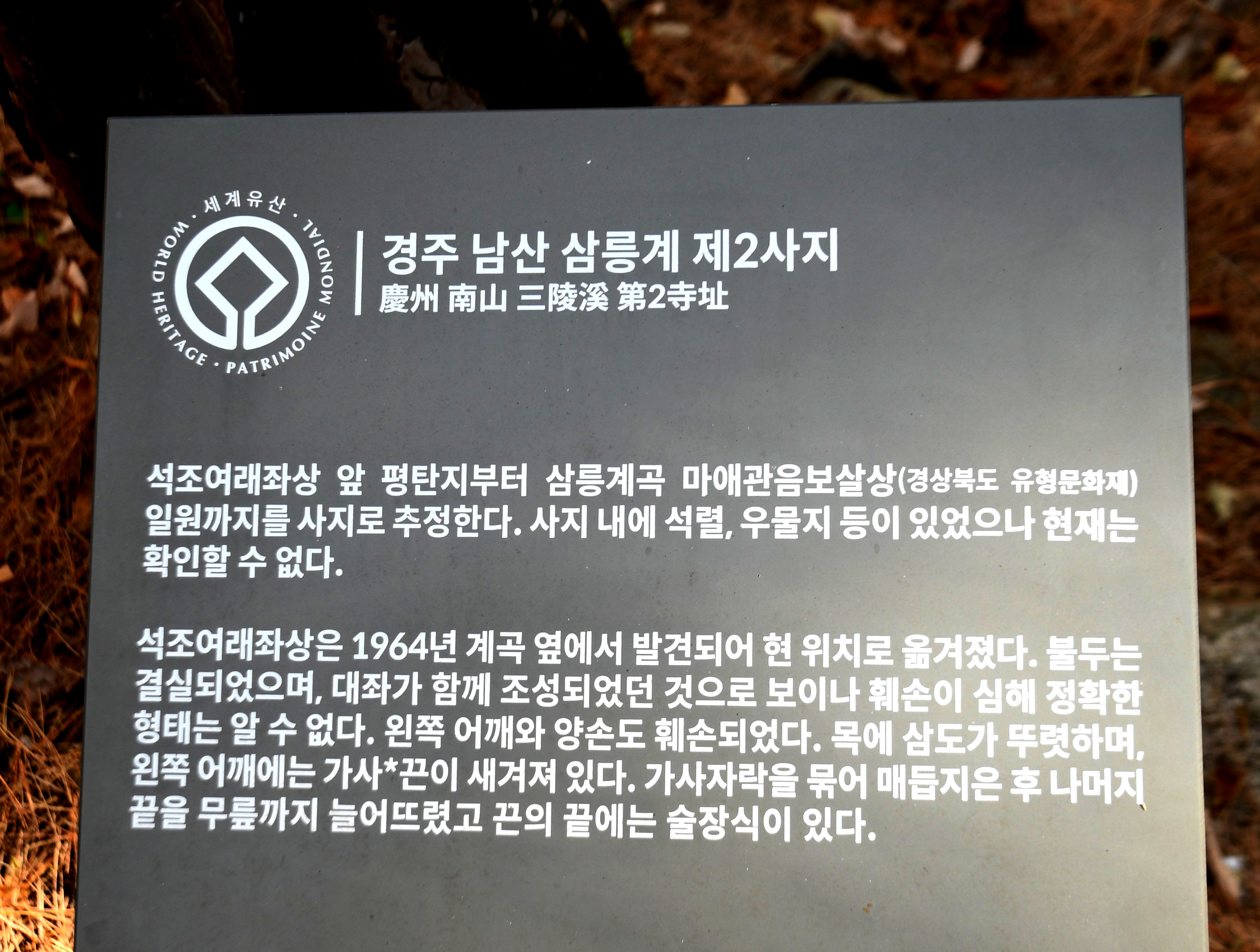 경주 남산은 고대 신라시대의 불교 유적이 밀집된 지역으로, 수많은 석불, 탑, 절터가 곳곳에 흩어져 있어 ‘야외 박물관’이라 불릴 정도로 문화재의 밀도가 높은 장소이다. 그중에서도 삼릉계곡은 특히 불교 조각의 보고로 손꼽힌다. 이 계곡을 따라 형성된 삼릉계 제2 사지에는 머리가 없는 석조 여래좌상이 남아 있어 학계와 일반 대중의 관심을 끌고 있다.