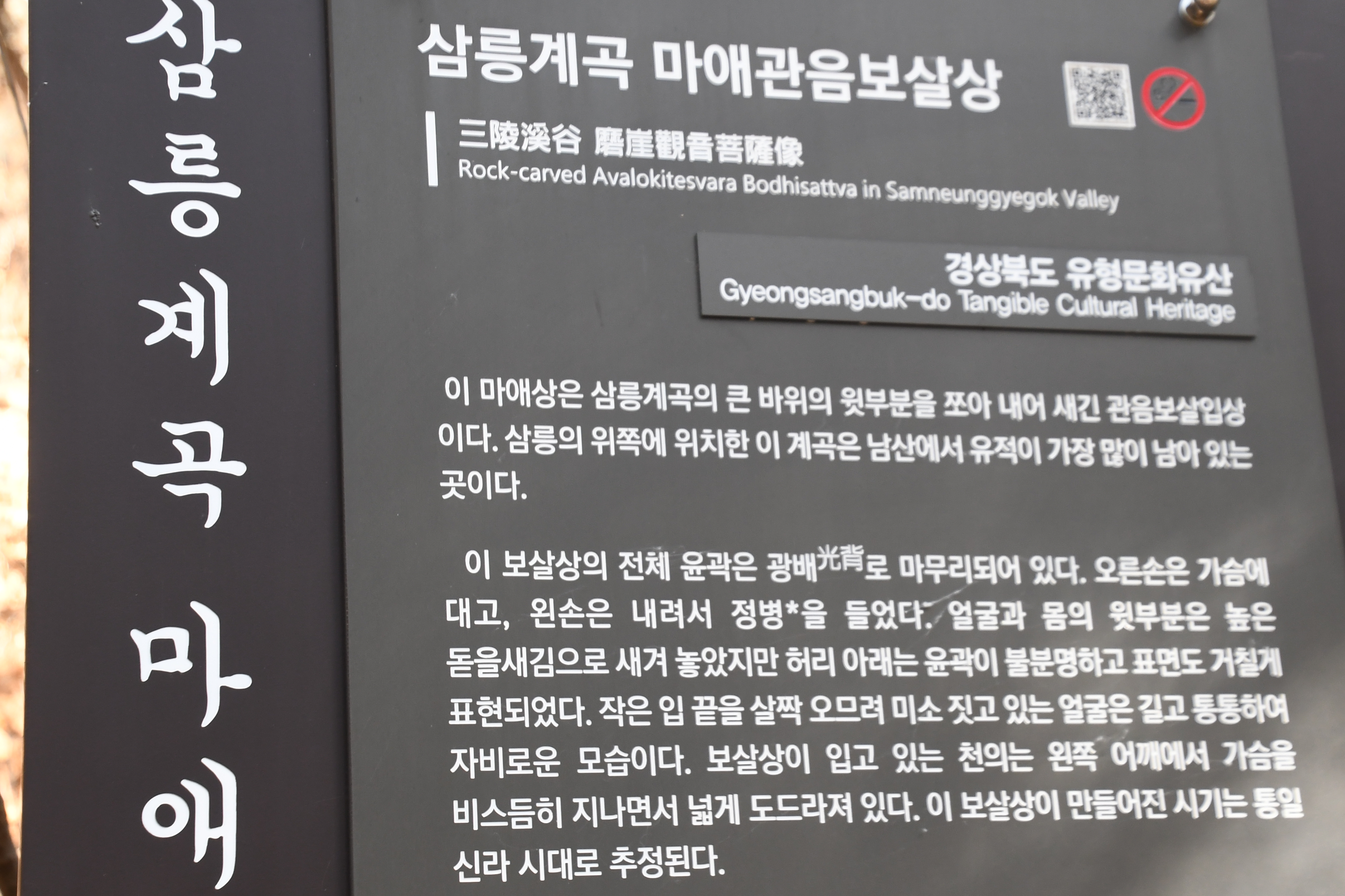 요약하면, 경주 삼릉계곡 마애관음보살상은 통일신라 시대 8~9세기의 고도로 발달한 불교 조각 예술을 보여주는 마애불로, 자연의 암벽을 이용해 표현된 자비로운 관음보살의 모습은 한국 불교미술의 대표적 작품 중 하나이다. 이 불상은 섬세하면서도 입체적인 조각수법과 자연광배가 특징이며, 경주의 불교문화유산으로서 매우 중요한 문화재로 보호되고 있다
