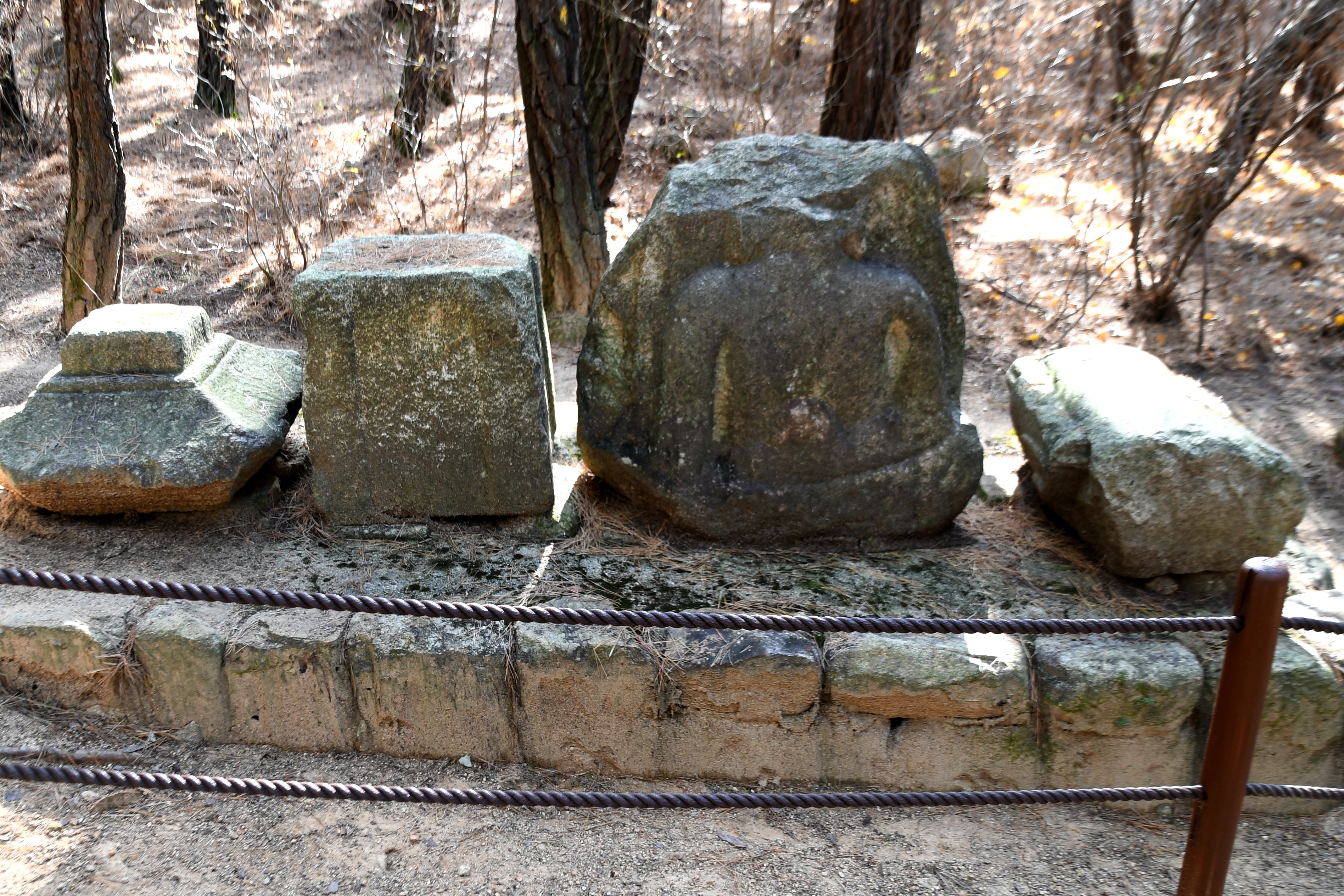 채로 흩어져 있었다. 과거 보존 작업에서는 일부를 시멘트로 보수했으나, 그 과정에서 원래의 석재와 이질적인
