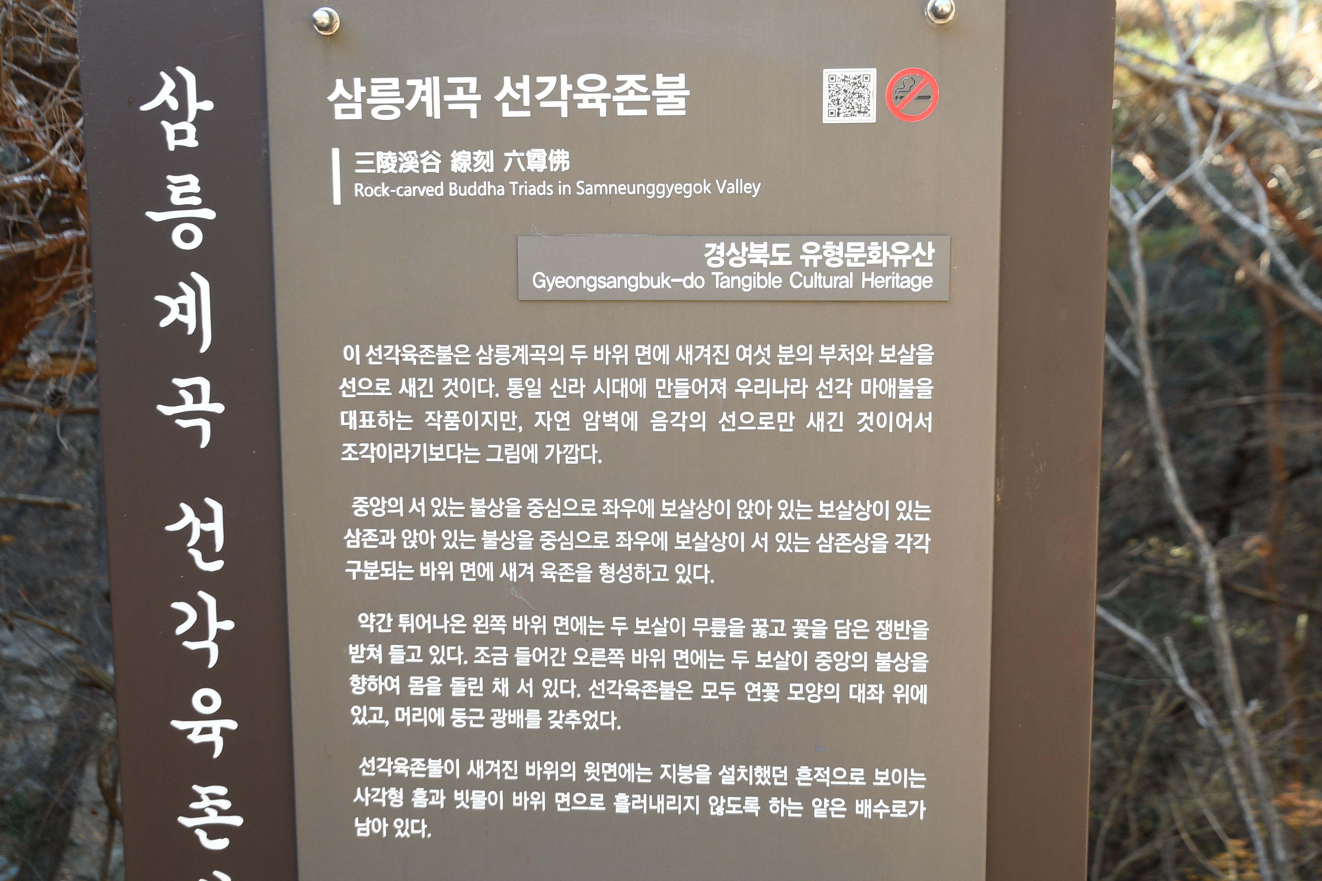 불상들의 자연암벽에 직접 선으로 새긴 조각 방식은 주변 자연과 절묘하게 조화를 이루면서도, 불경에서 말하는 불법(佛法)의 상징성과 예술성을 한껏 드러낸다. 이처럼 삼릉계곡 선각육존불은 경주의 불교문화유산 가운데에서도 중요도가 높고, 선각 불화 연구에 있어서도 빼놓을 수 없는 역사·문화적 자산이다.