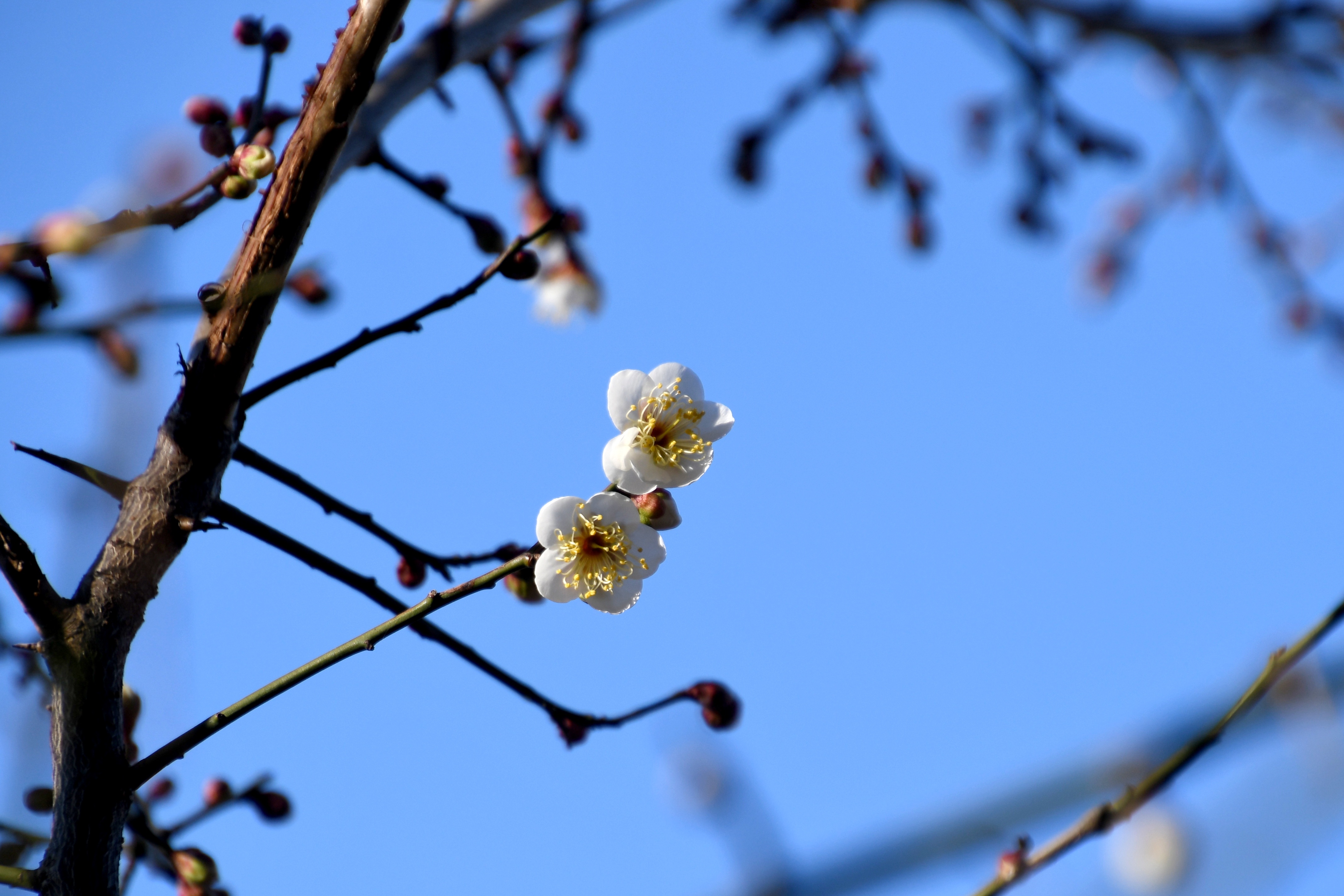 꽃은 2-4월에 흰색 또는 분홍색으로 피며 향기가 강하다. 꽃받침잎은 둥글다. 꽃잎은 도란형이고 털이 없다.