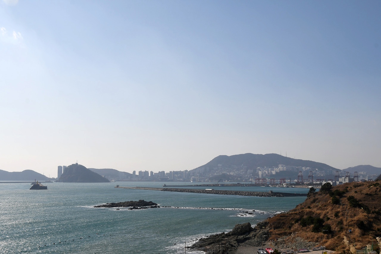 좌측은 해양대학교가 있는 조도 오른쪽은 신선대부두 뒷산은 수정산