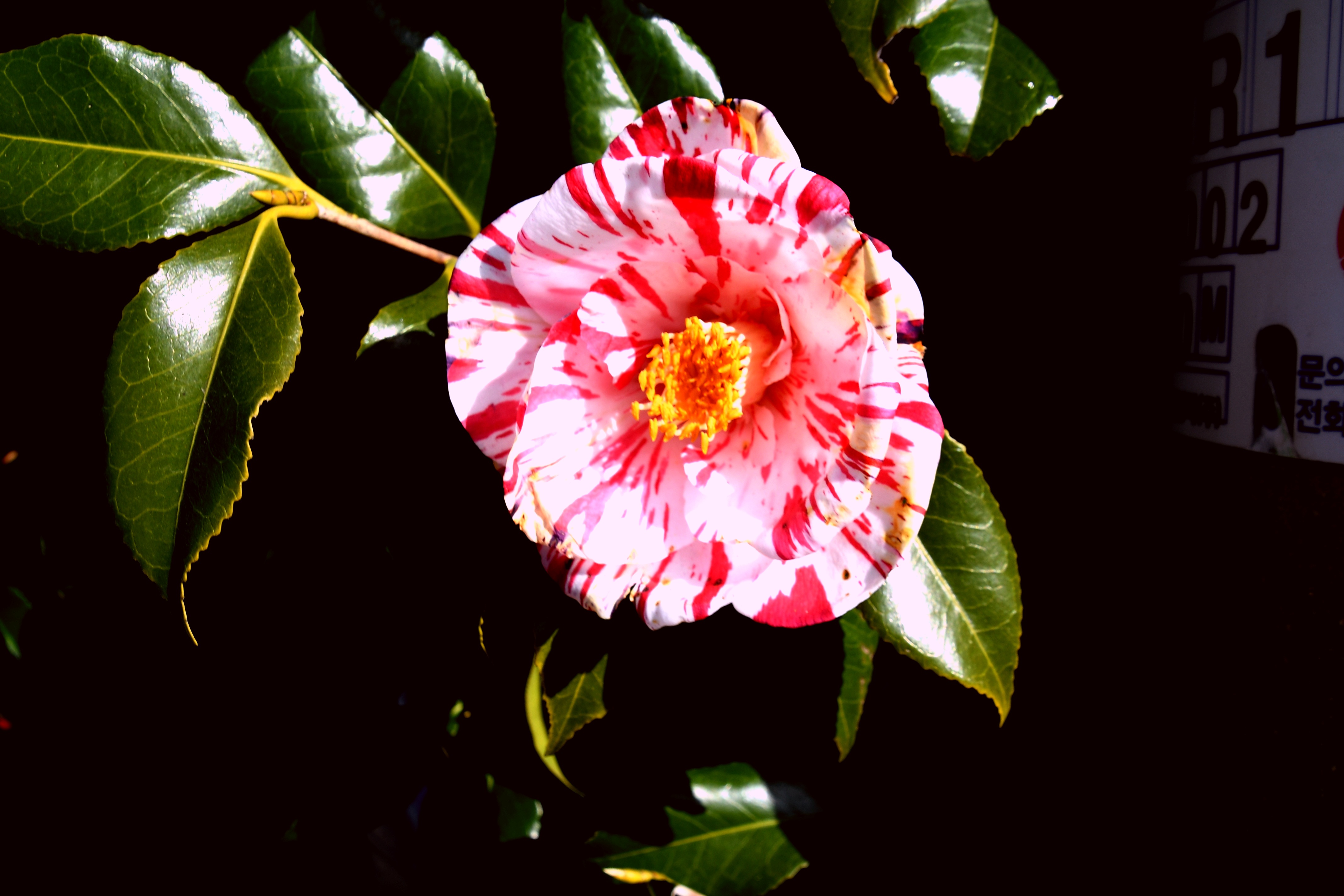 동백나무군락지로 가면서 길가에 동백나무 이러한 꽃과 붉은 꽃이 한 나무에서 핀다