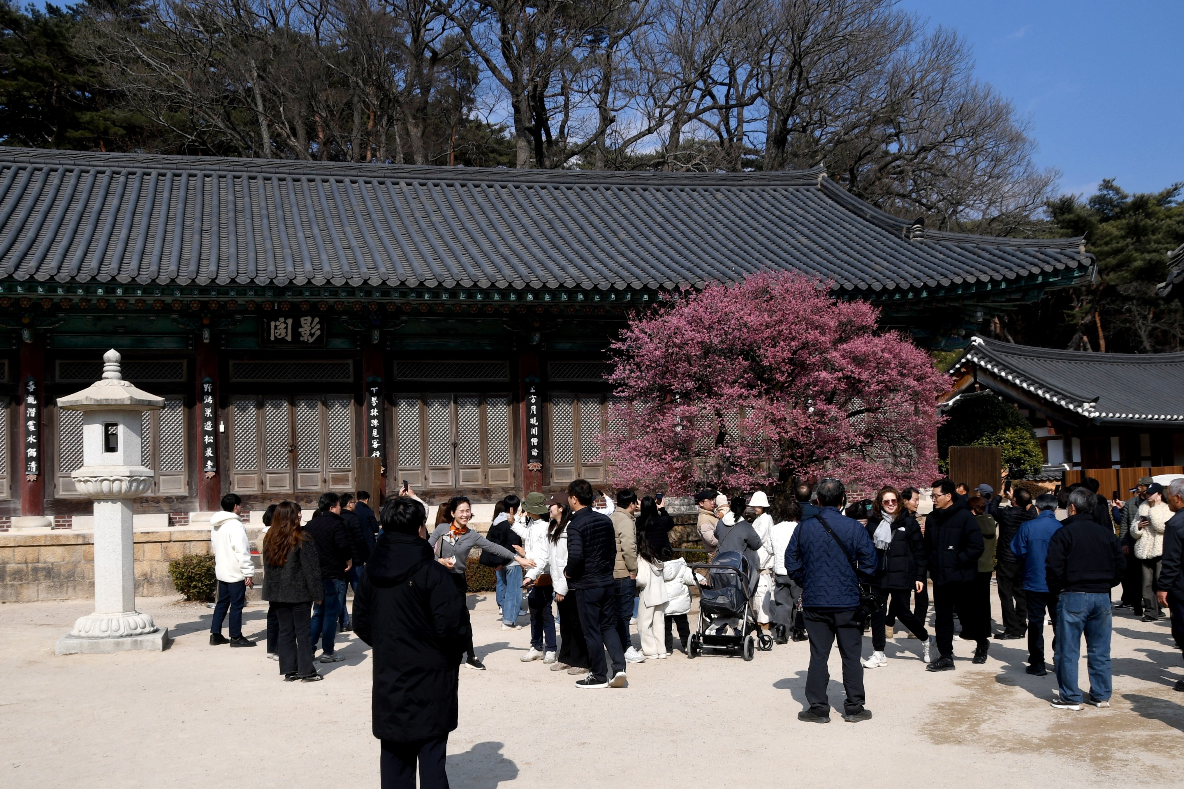 일주문 앞의 수양매 이제 피고 있는 중이다