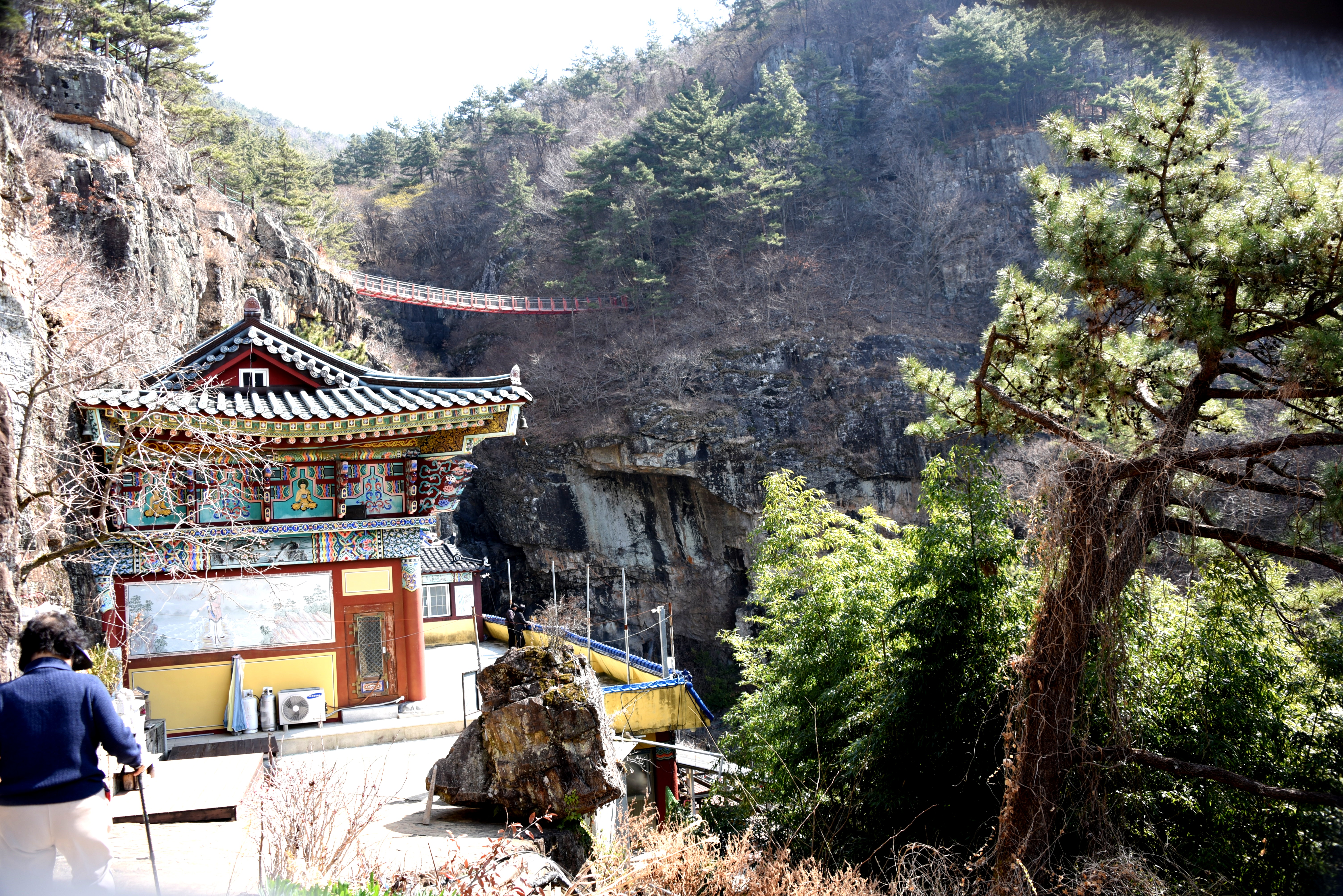 절벽에 바짝 기댄 폭포암과 구절 폭포, 출렁다리의 아름다운 풍광은 신비롭게 느껴지기도 한다.