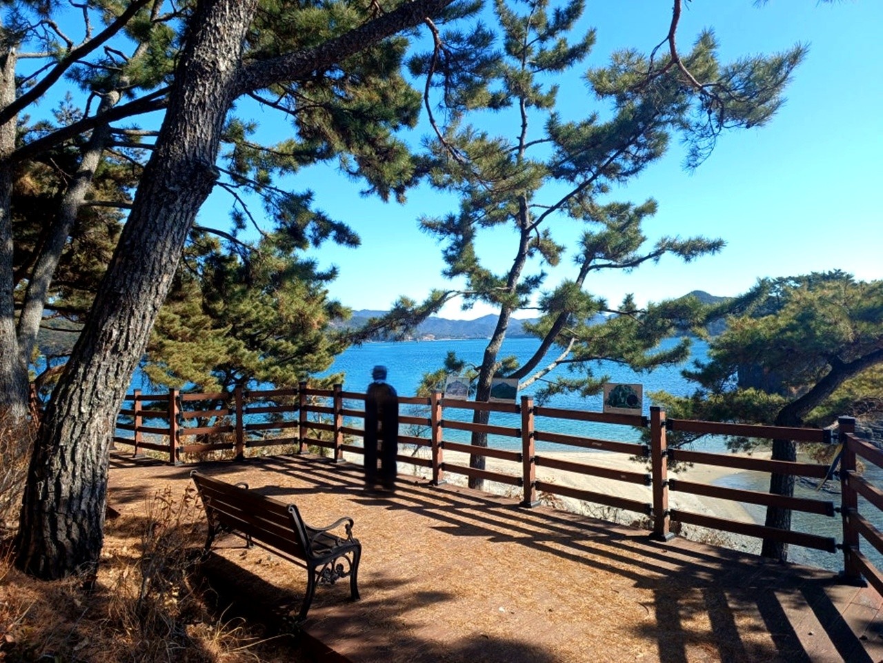 데크길을 내려가 장여 쪽을 보니 백사장도 보이는데 이래 쪽에는 돌들이 있어 해수욕장으로는 맞지 않을 것 같다