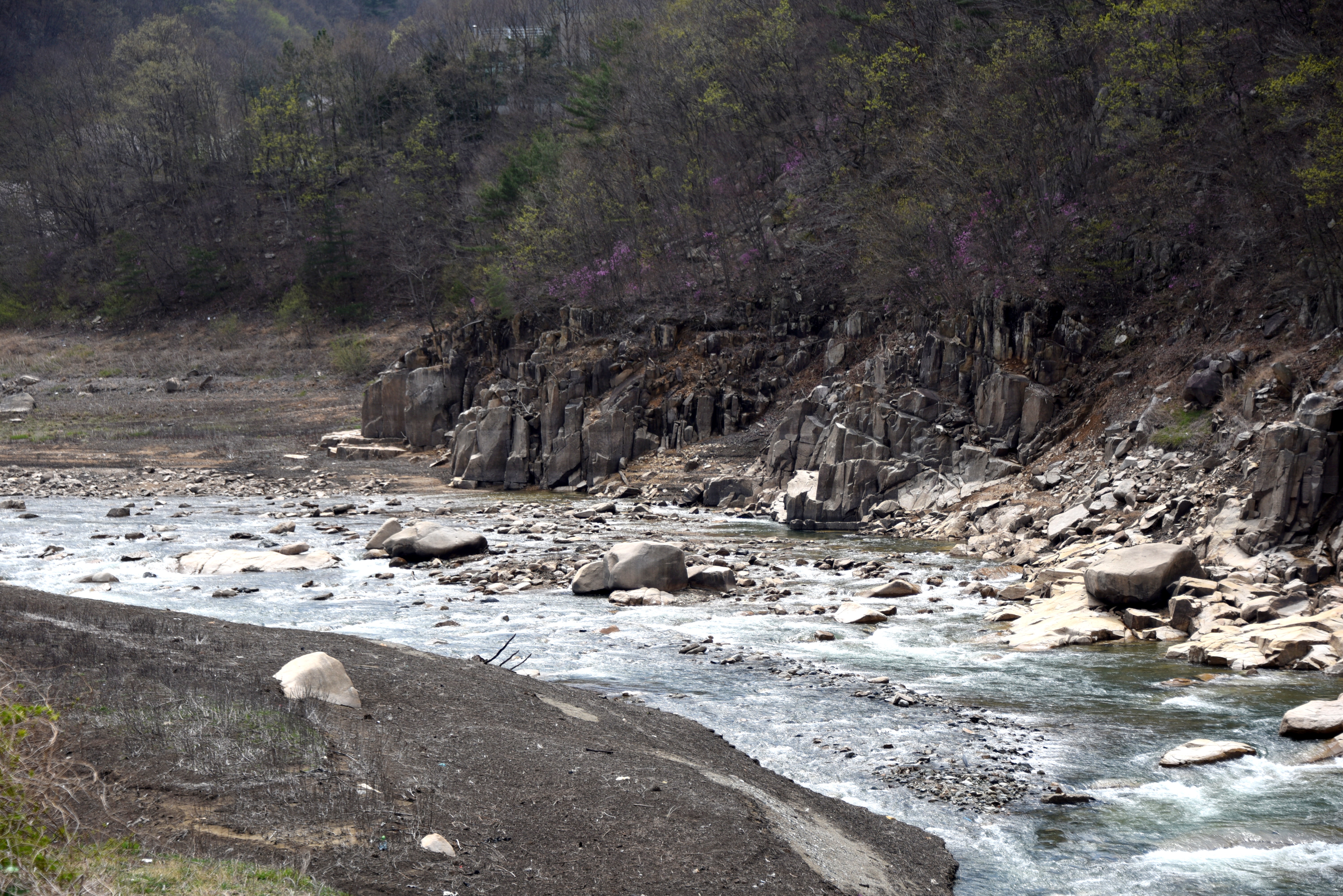 만수 때는 저 바위벽 위까지 물이 차는데 겨울가뭄으로 수위가 엄청 내려갔다
