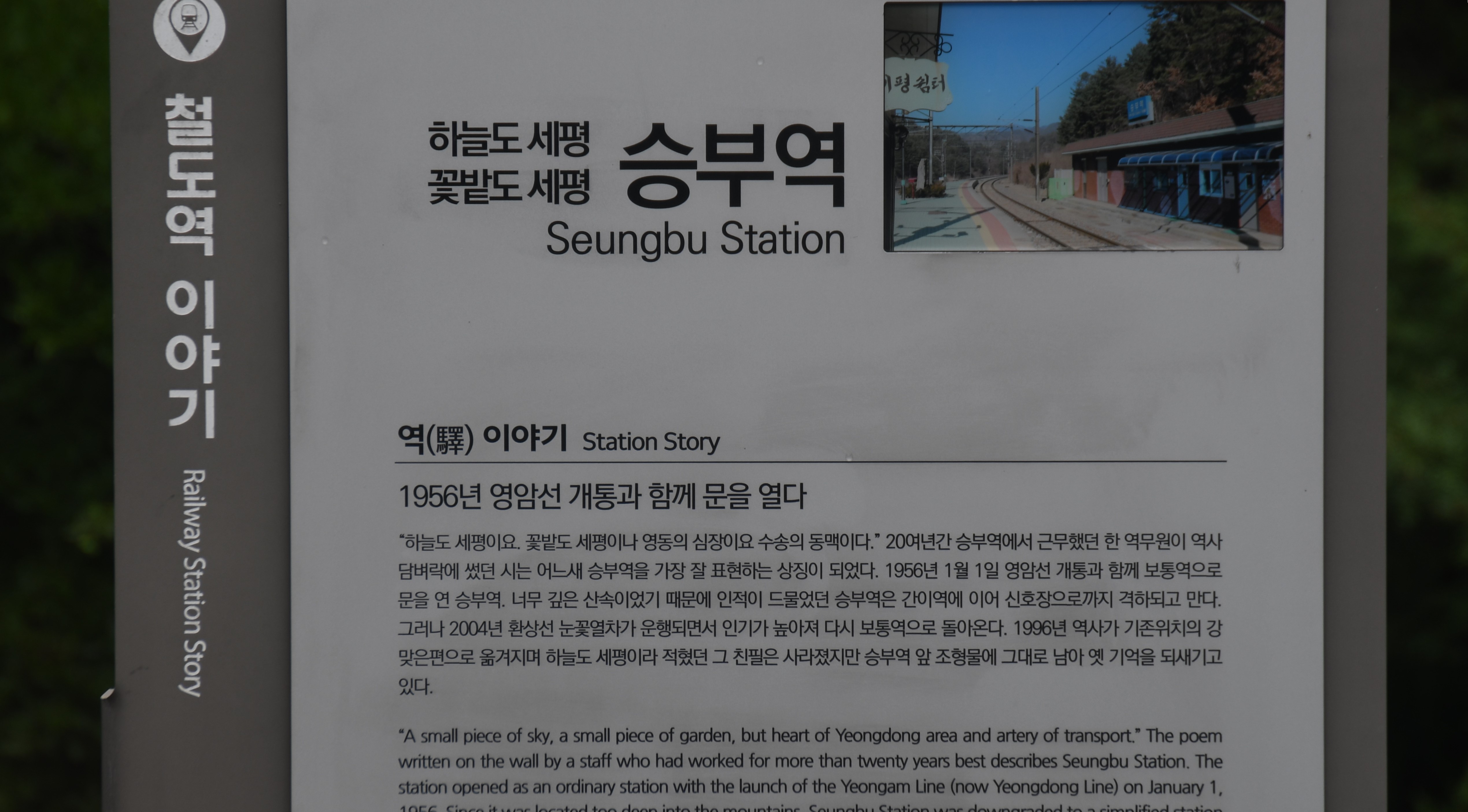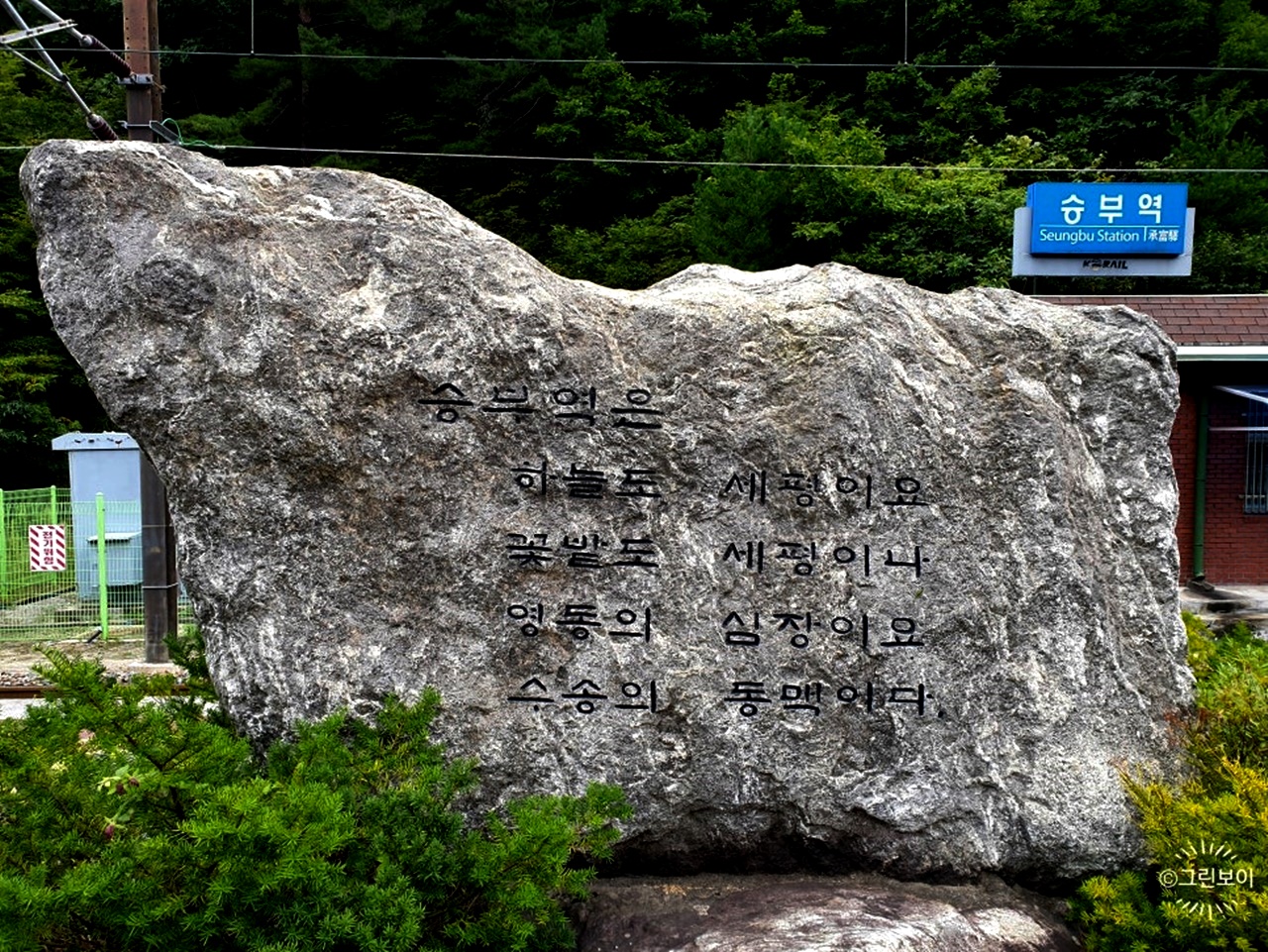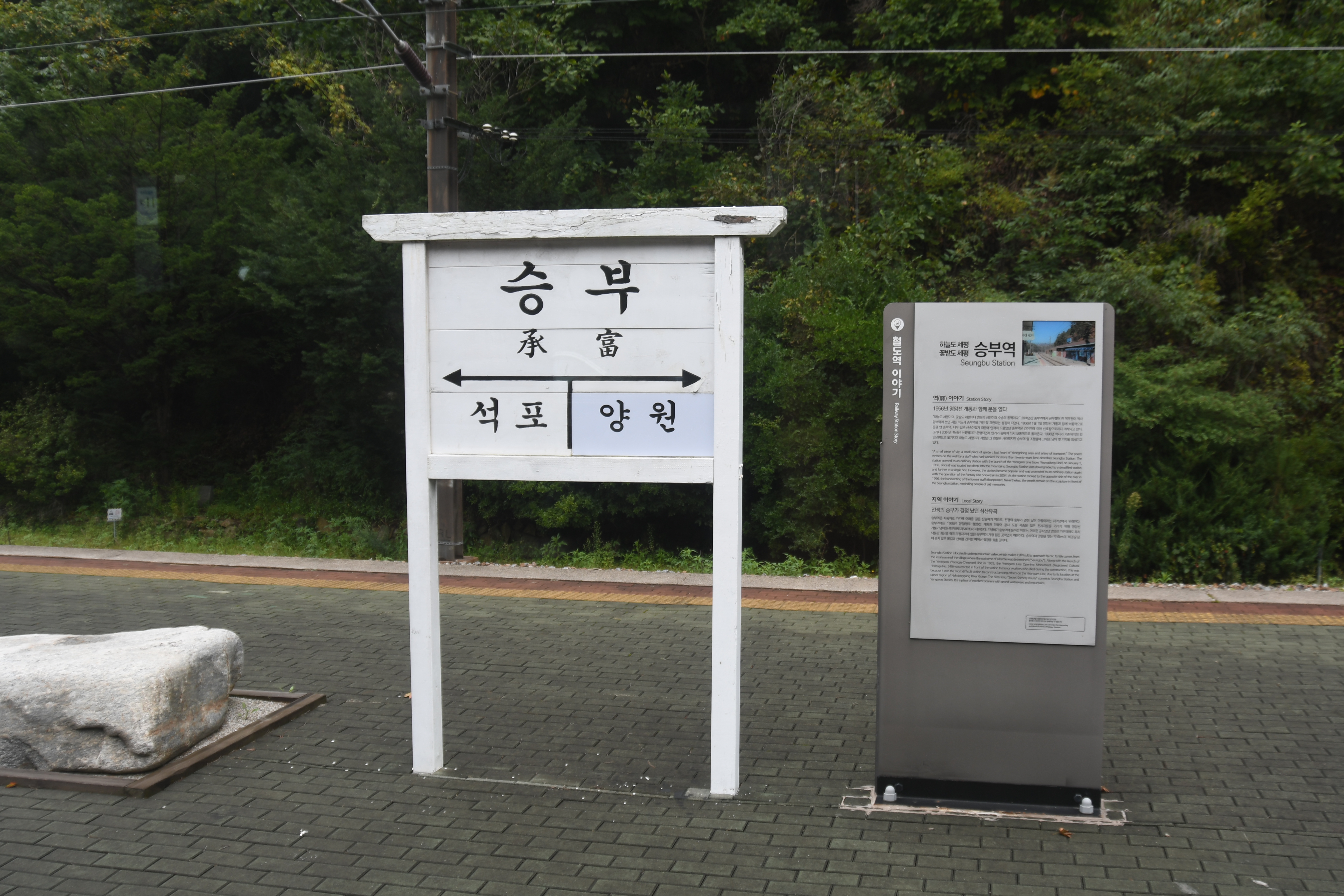 역의 승강장 중앙에는 과거 역장이 지었다는 “승부역은 하늘도 세평, 꽃밭도 세평이나 영동의 심장이요