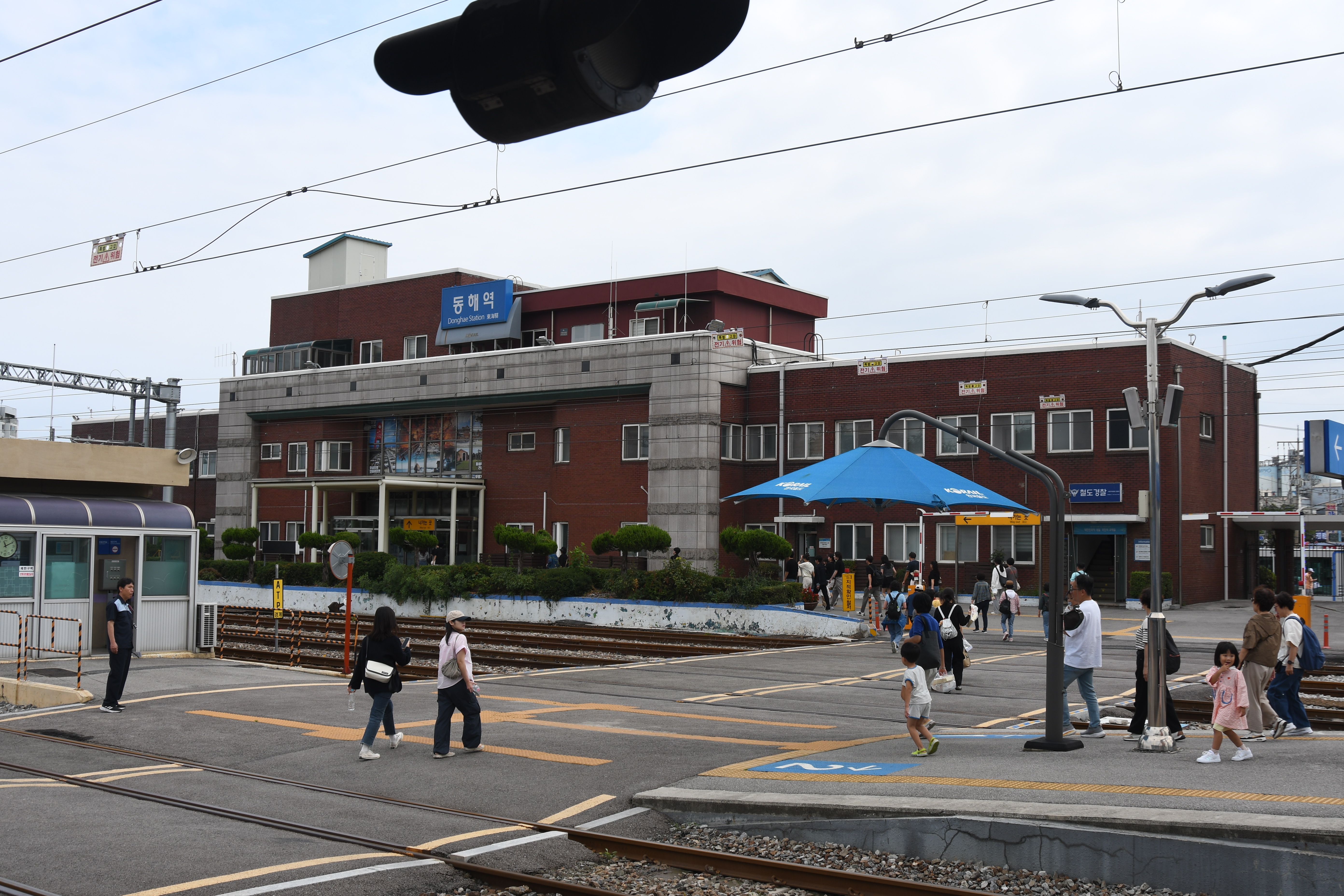 이 기 차가 현동역에서는 정차를 안 하는데 이곳 양원역에서는 정차를 하고 있다